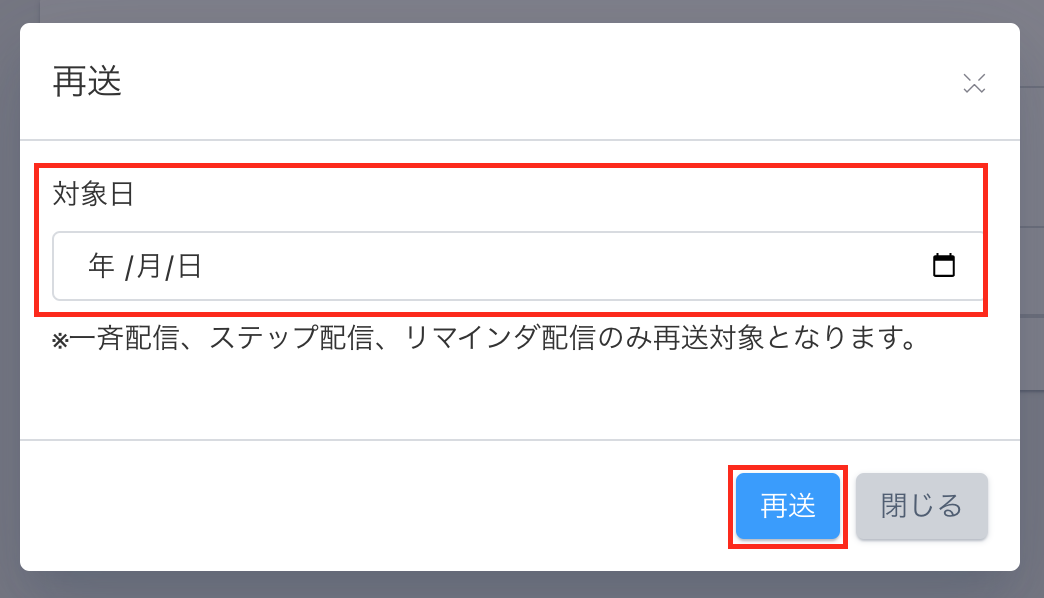 2.再送したいエラー配信の日時を指定し、【再送】ボタンを押下することで再送が可能です