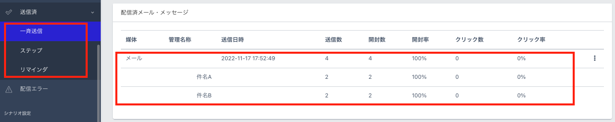 送信済みのメールを参照すると、ABテストのパターンごとの開封率やクリック率が確認できます。