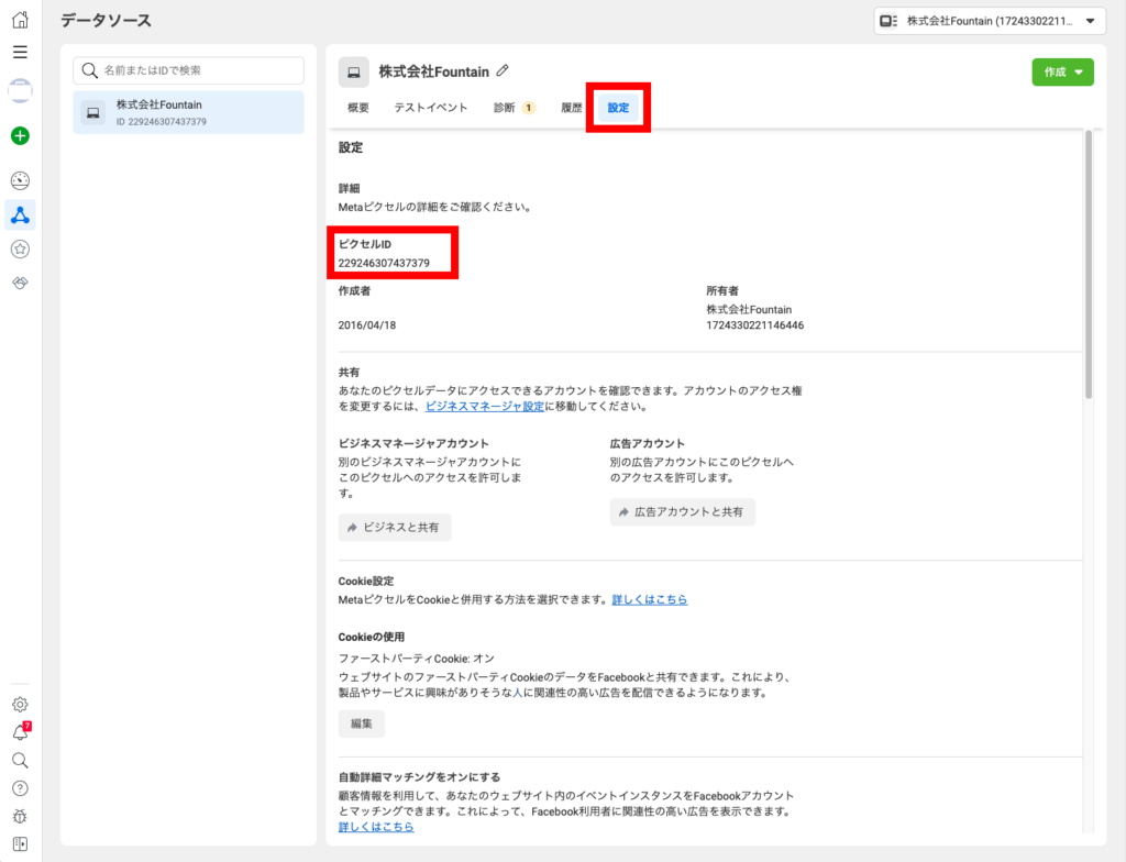 設定タブに表示されているピクセルIDを取得します。