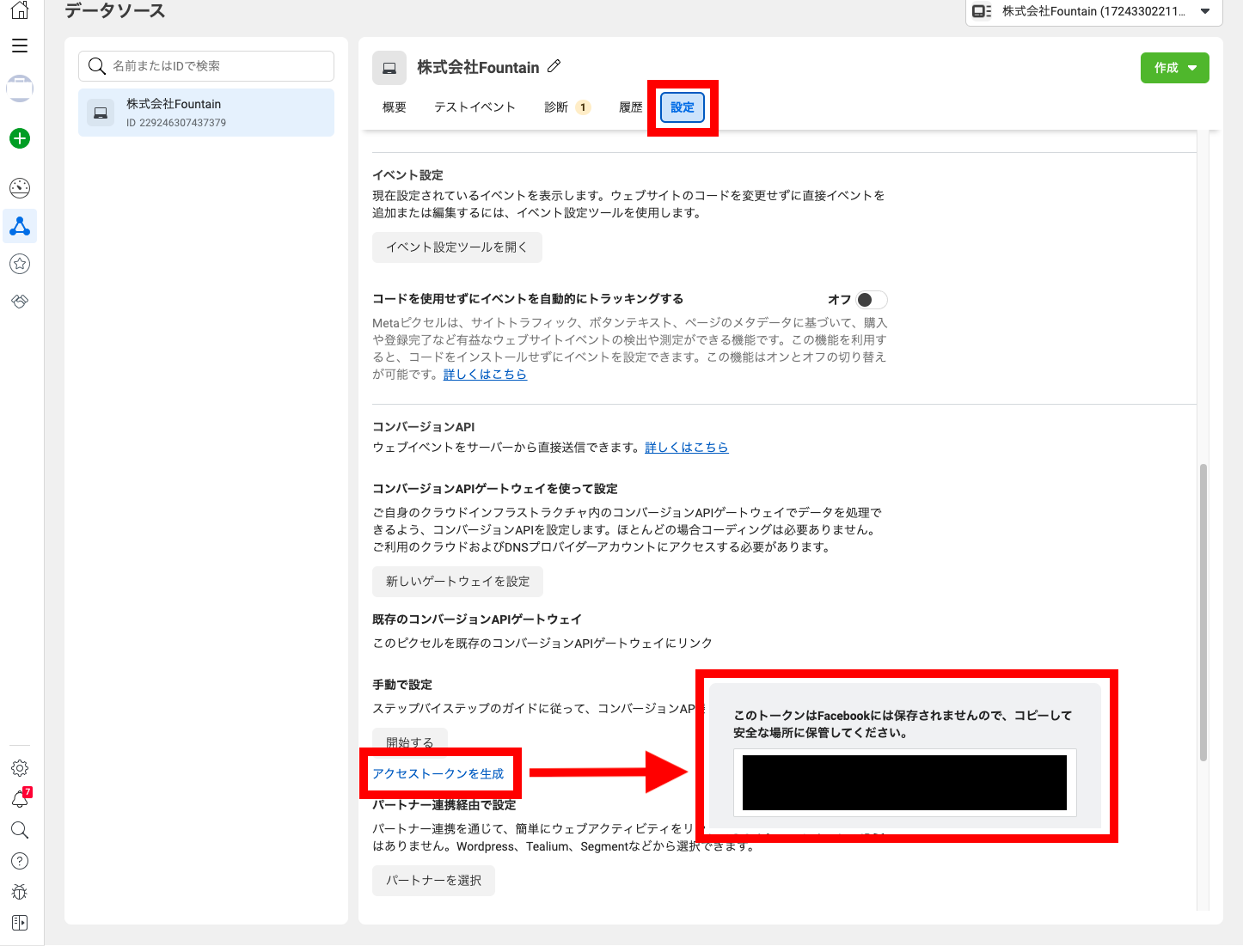 Facebook広告のデータソースの画面で