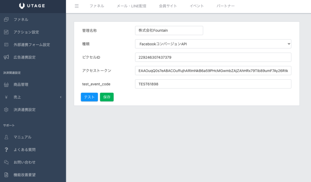 UTAGEの広告連携設定の画面に戻り「保存」ボタンを押します。