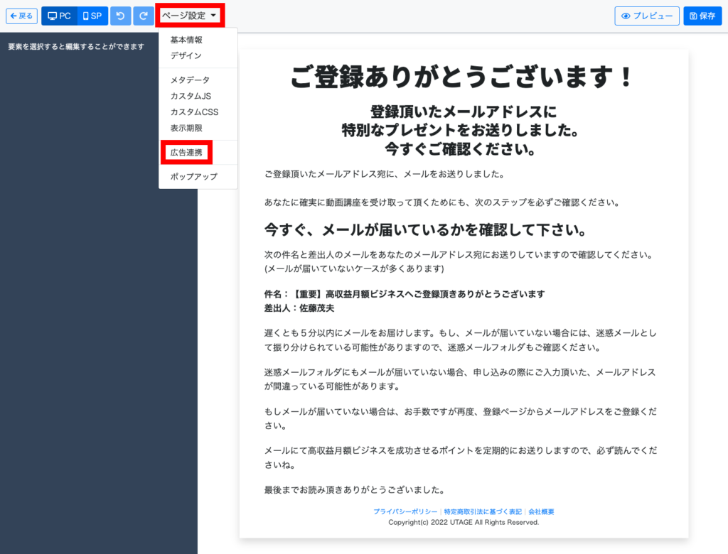 ページ設定>広告連携を開きます。