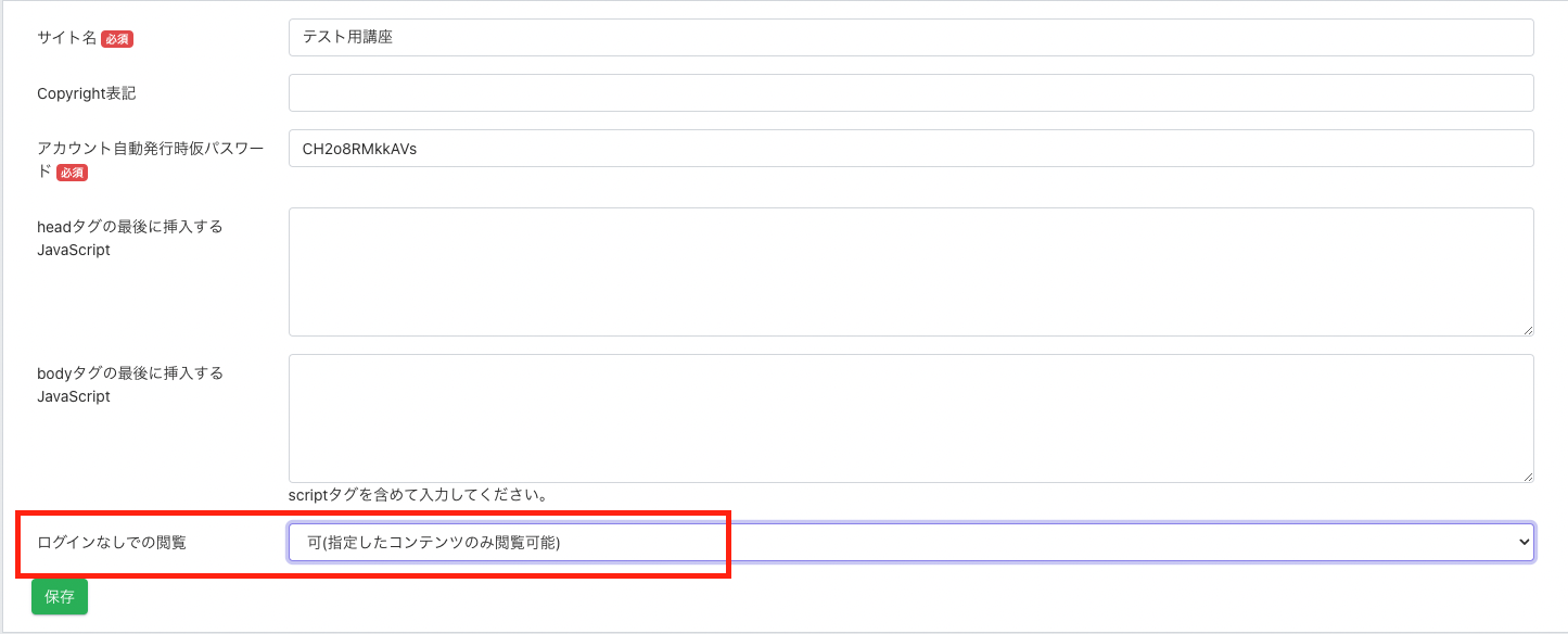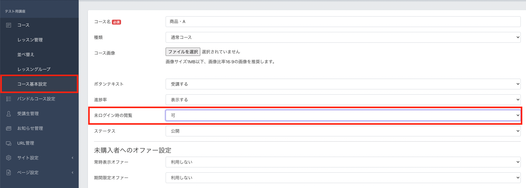 5. 「コース基本設定」>「未ログイン時の閲覧」を可に設定します。