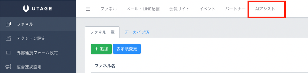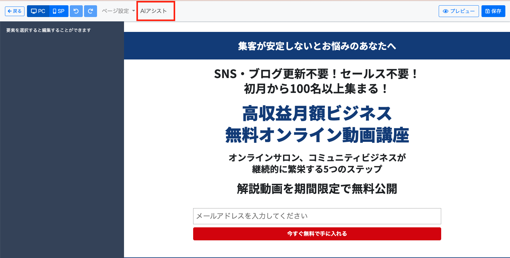 1.ファネルからページの編集画面を開き【AIアシスト】をクリックします。