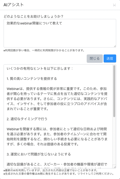 ゼロベースで文章作成が苦手な方は、AIアシスト機能を使って文章の草案やたたき台を作ってもらうことが可能です。