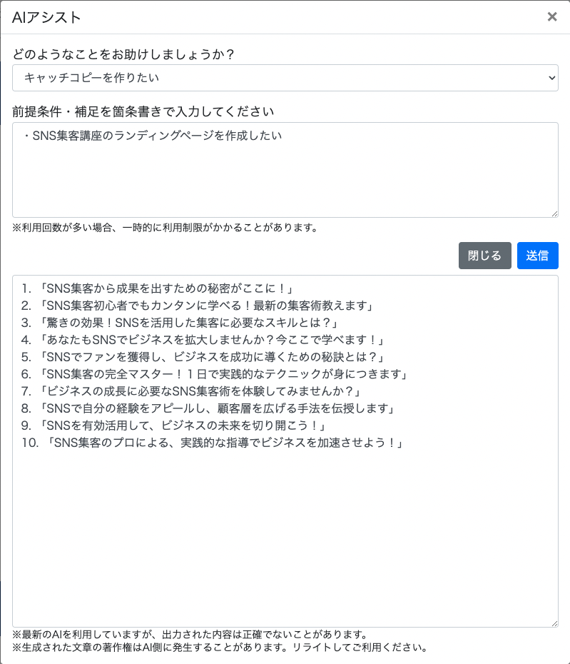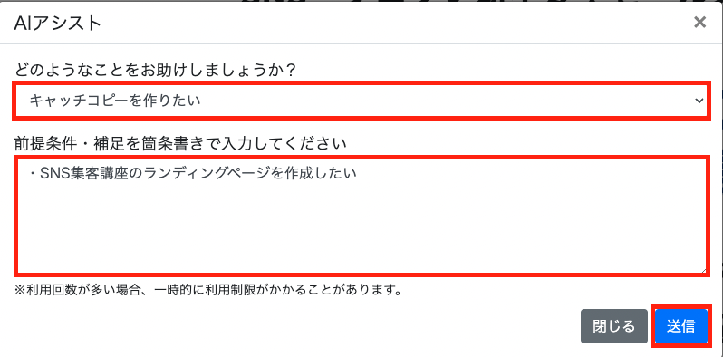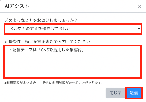 2.AIアシストが表示されますので、内容を記入して【送信】をクリックします。