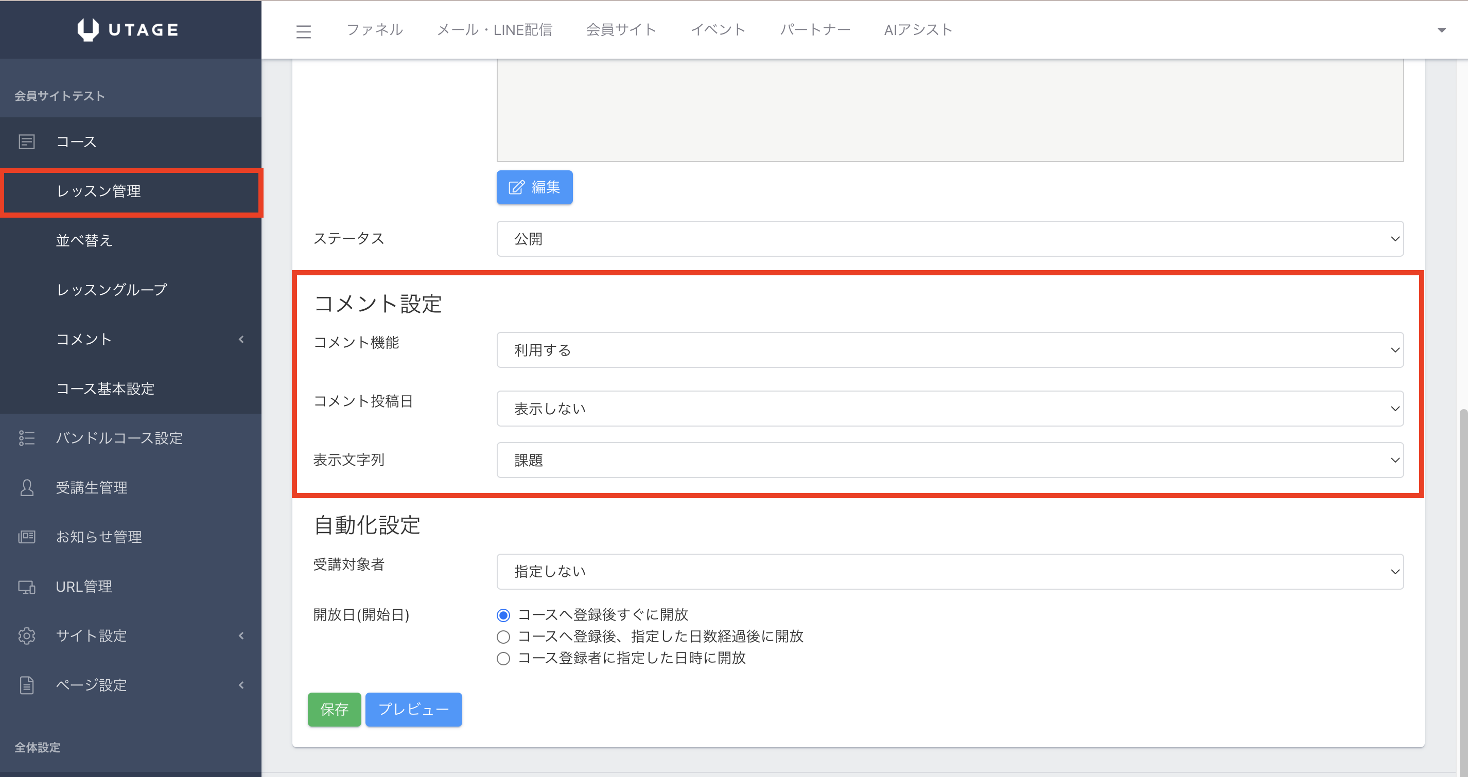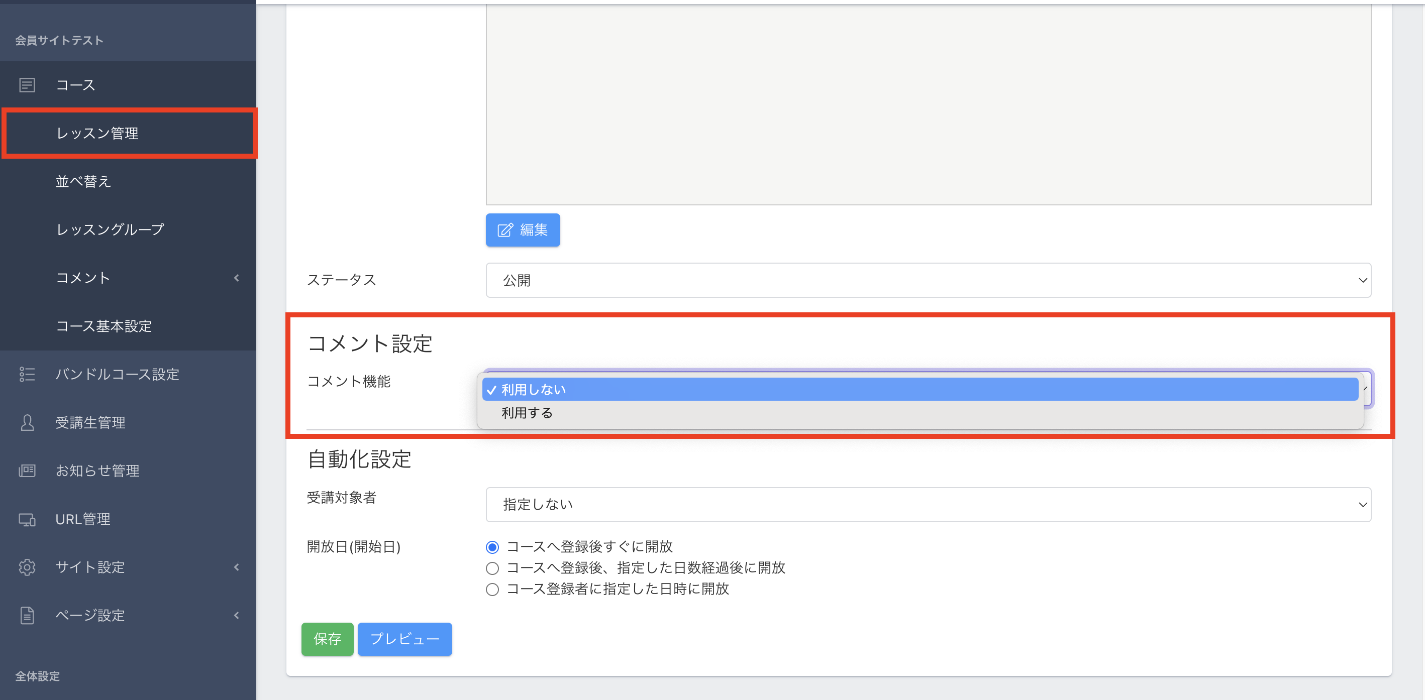 コメント機能を利用するには、レッスンごとに設定が必要です。
