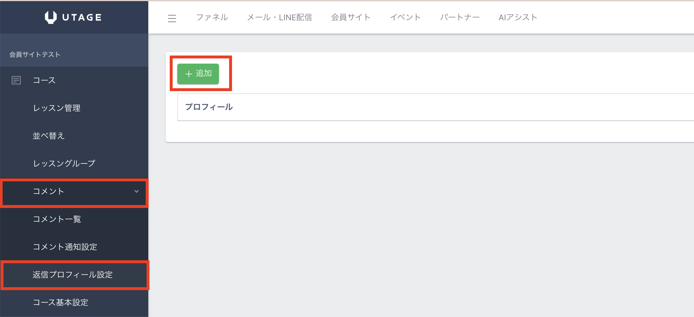 1. 【コメント】>【返信プロフィール設定】>【+追加】をクリックします。