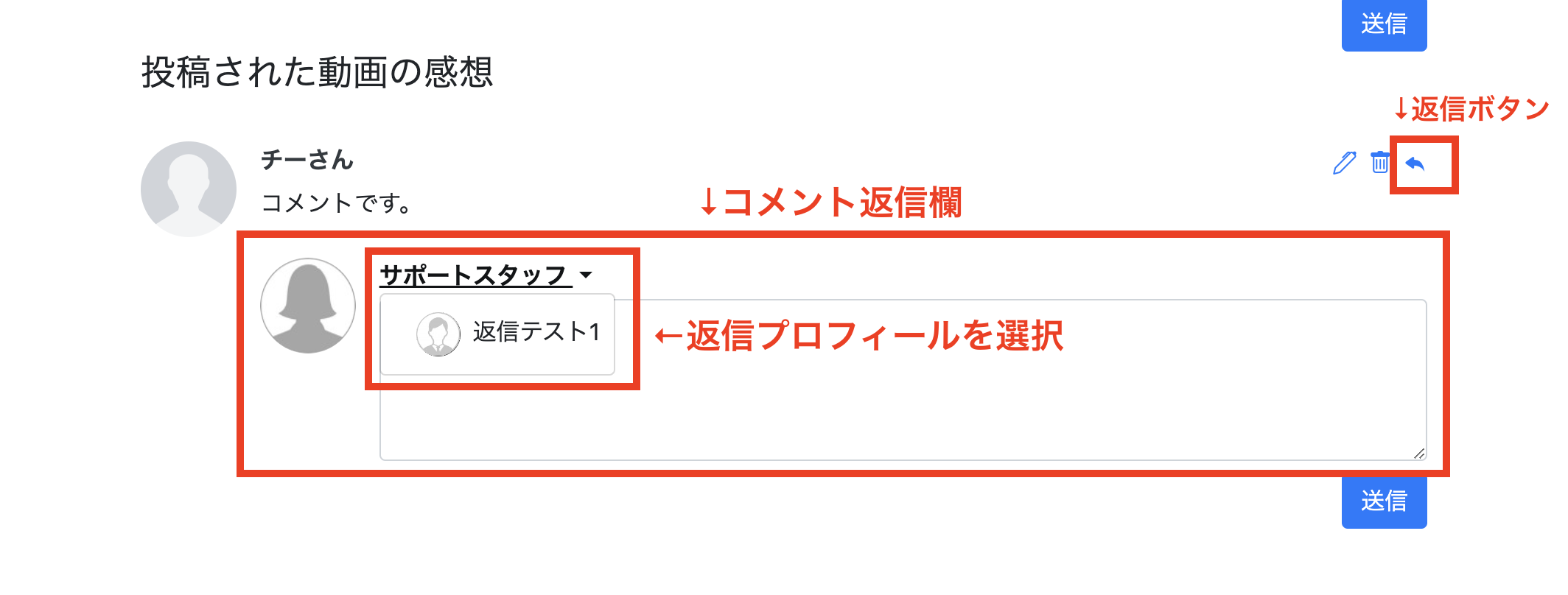 返信プロフィールを選択してコメント返信文を入力し、送信ボタンを押下します。