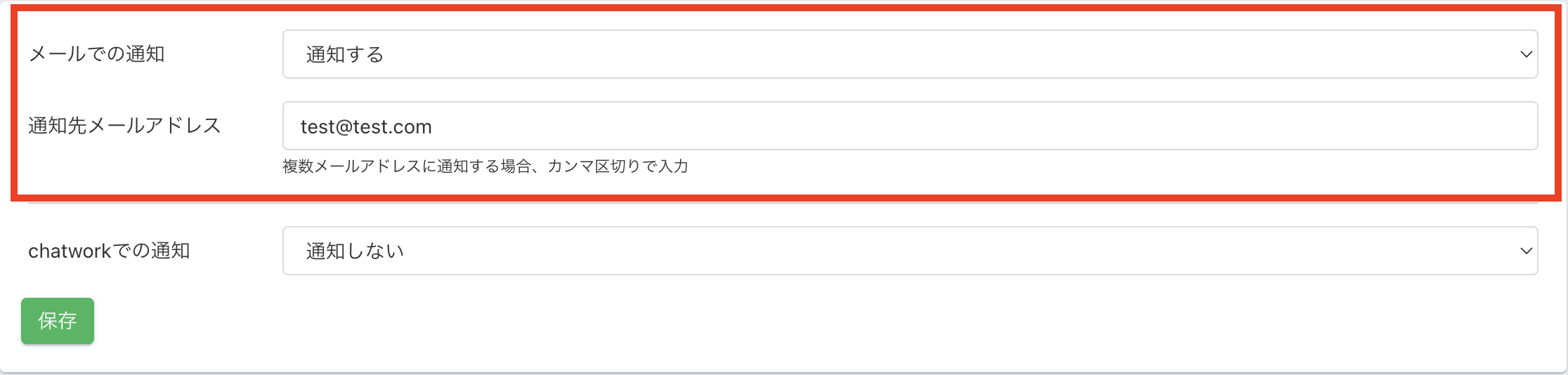 ・通知先メールアドレス:通知するメールアドレスを記入します。複数メールアドレスに通知する場合、カンマ区切りで入力してください。