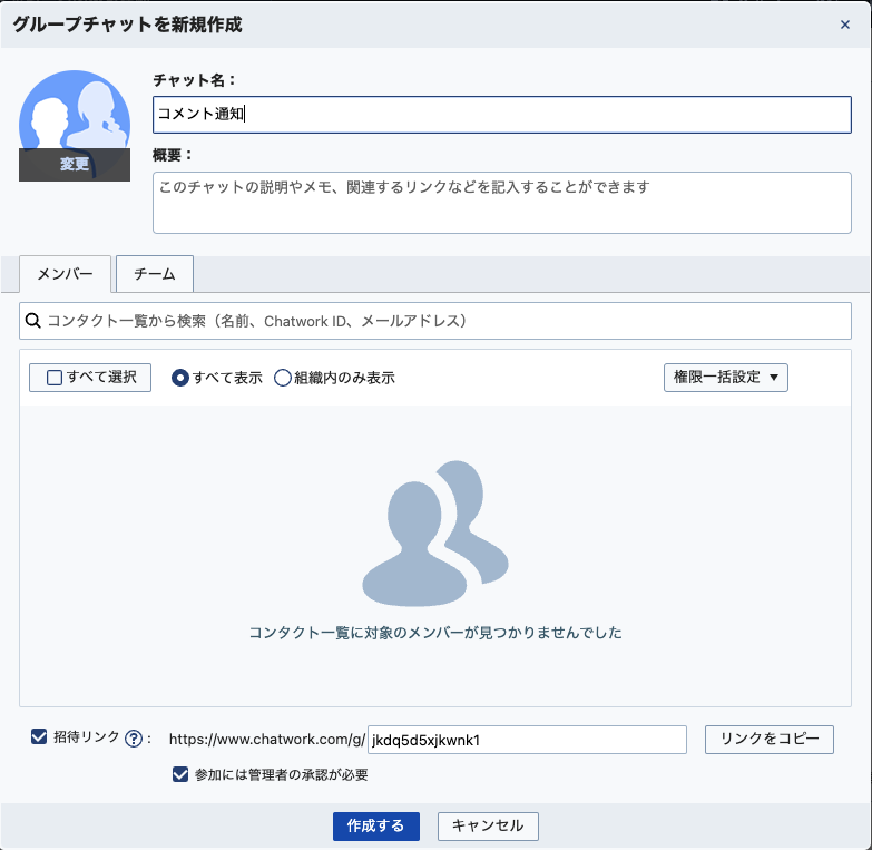 3.作成したグループチャットに通知を受け取りたいChatworkアカウントを追加します。