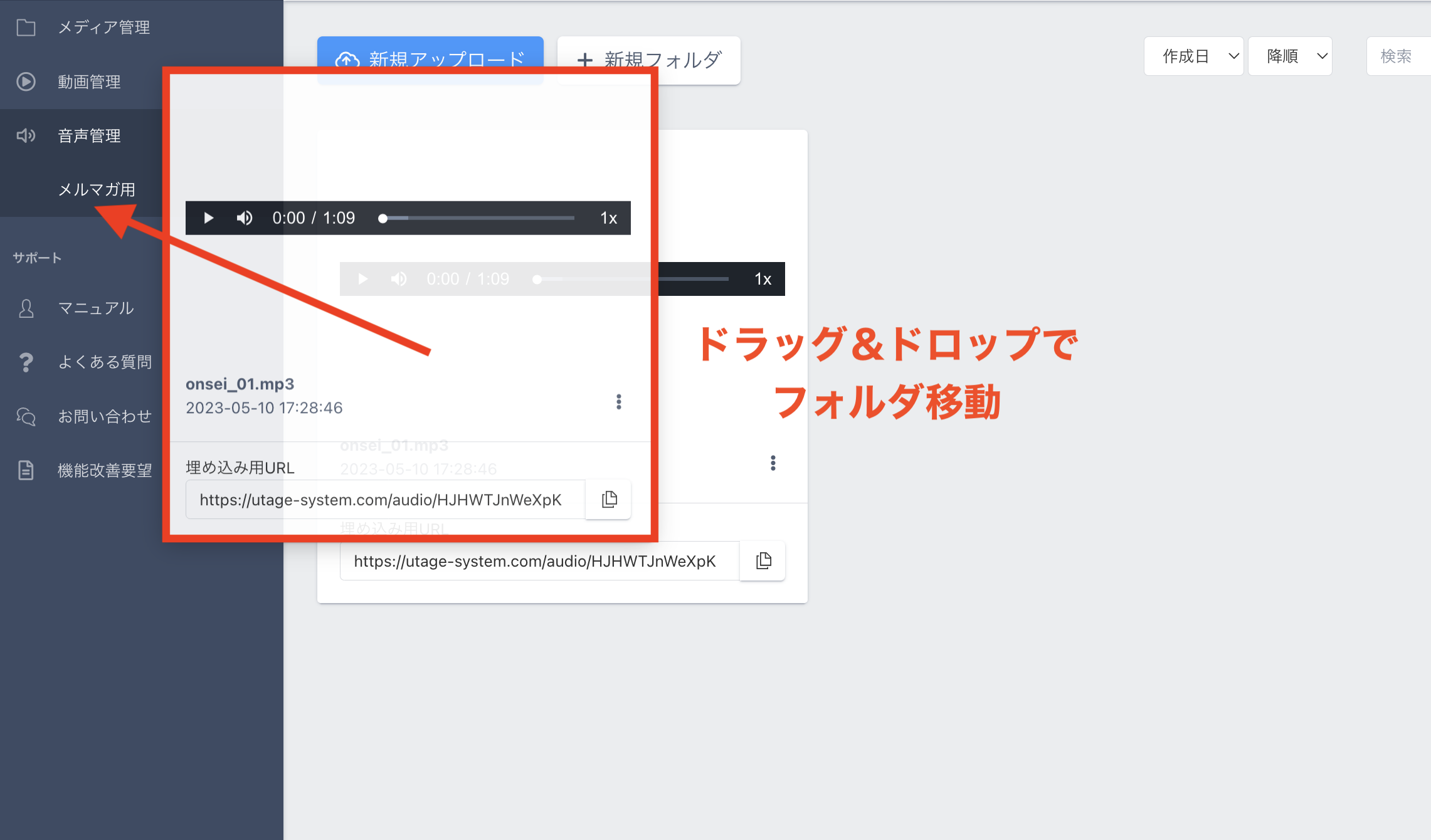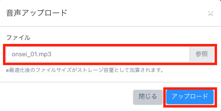 ※複数の音声ファイルを同時にアップロードする場合は、ドラック&ドロップでアップロードして頂けます。