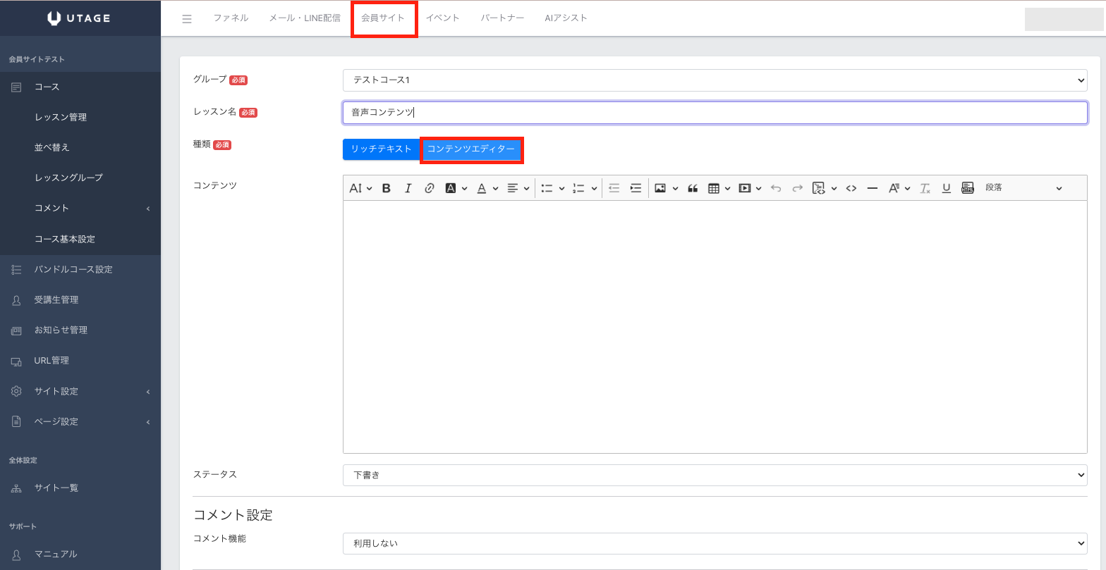 ※会員サイトで『音声要素』を利用する場合は、【コンテンツエディタ】のみ挿入が可能です。