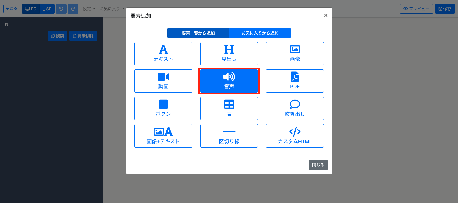 【コンテンツエディタ】より『音声要素』を挿入することができます。