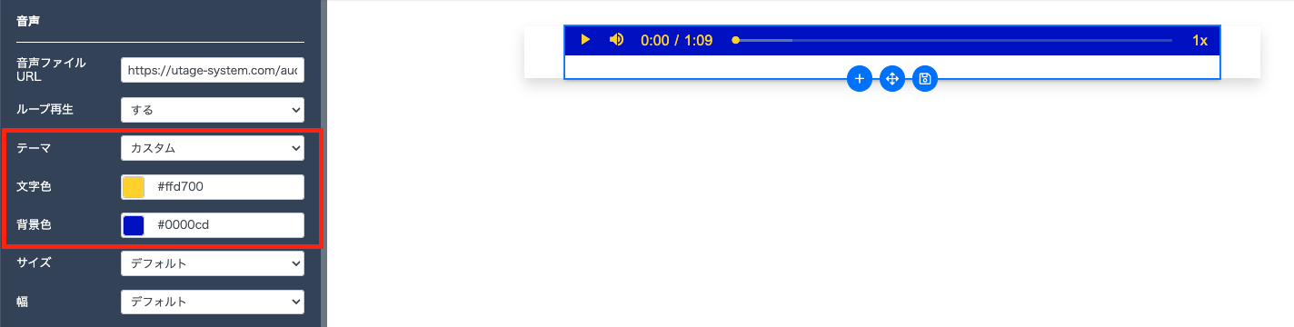 『ループ再生』『テーマ』『サイズ』『幅』の設定ができます。