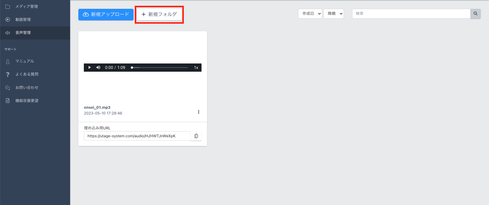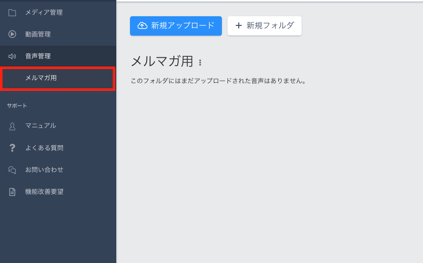 音声をフォルダごとに管理することができます。『+新規フォルダ』をクリックしてフォルダを作成します。