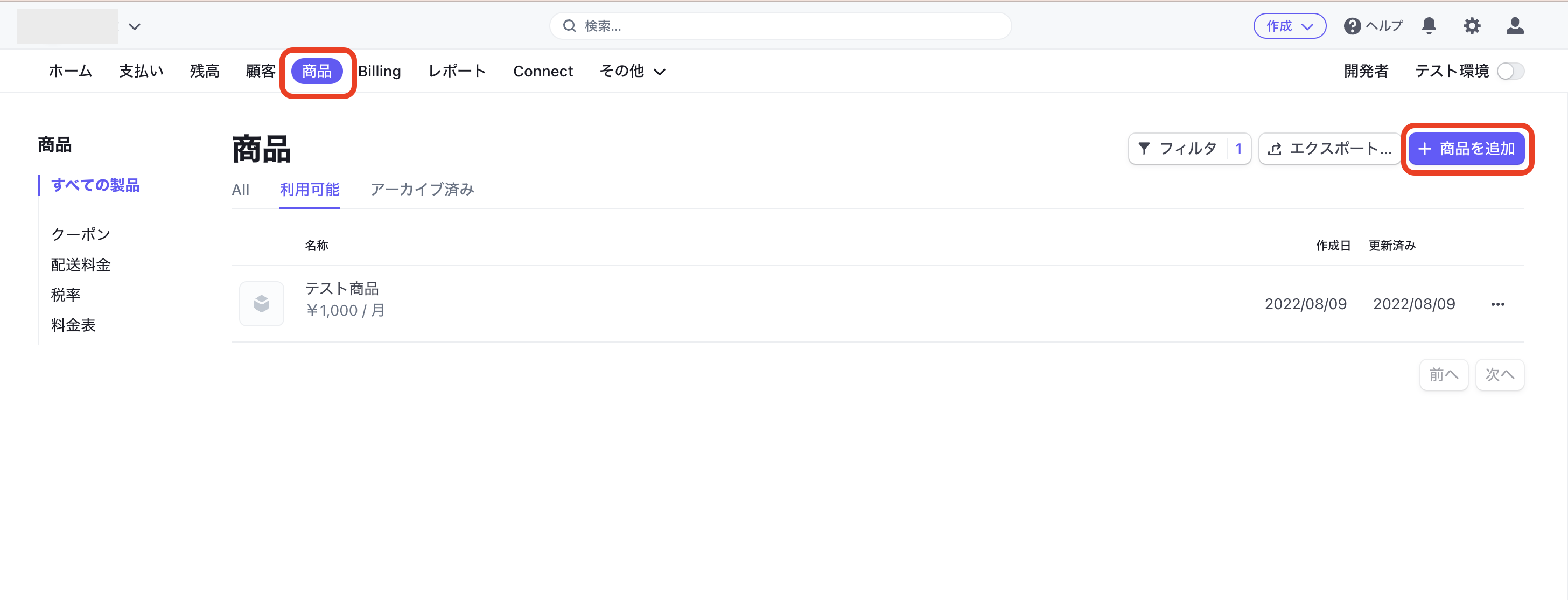 手順1.「Stripe」にて「商品」にある【商品の追加をクリックします。