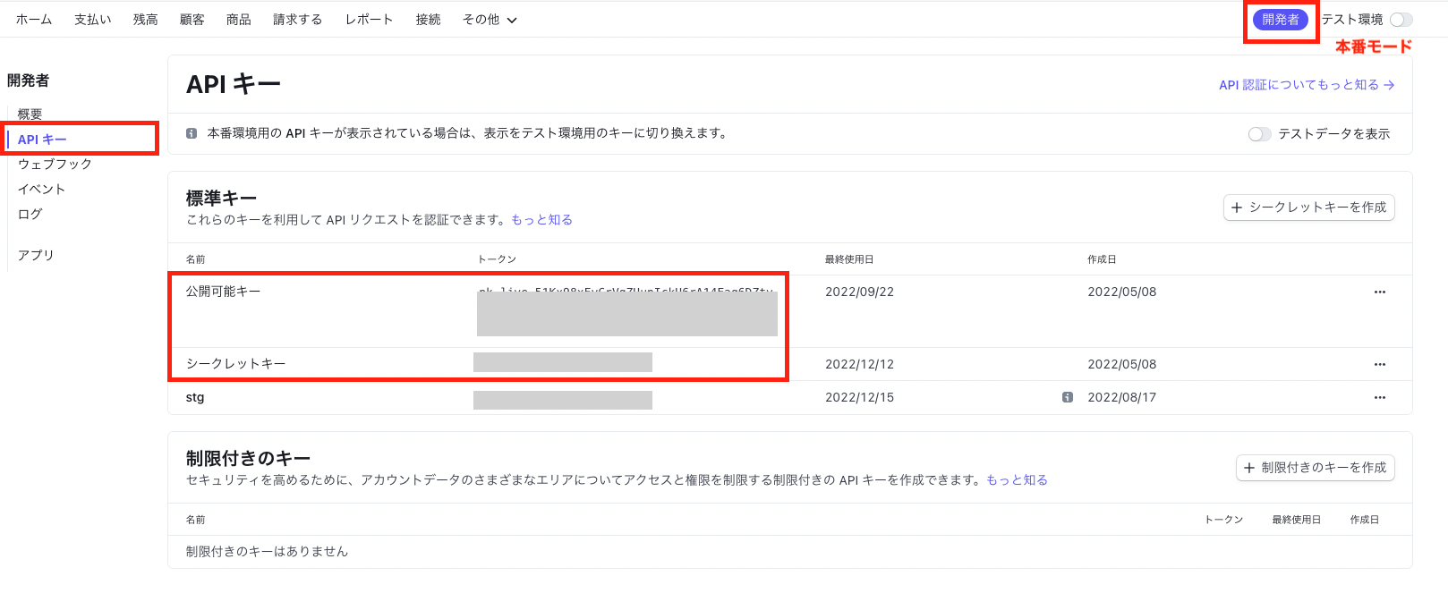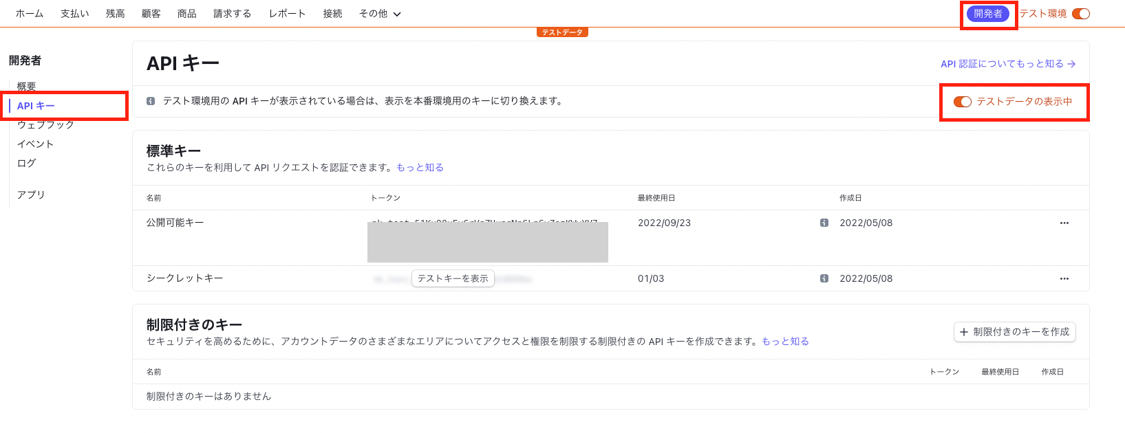 2. 「開発者>APIキー」より「公開可能キー」と「シークレットキー」を取得します。