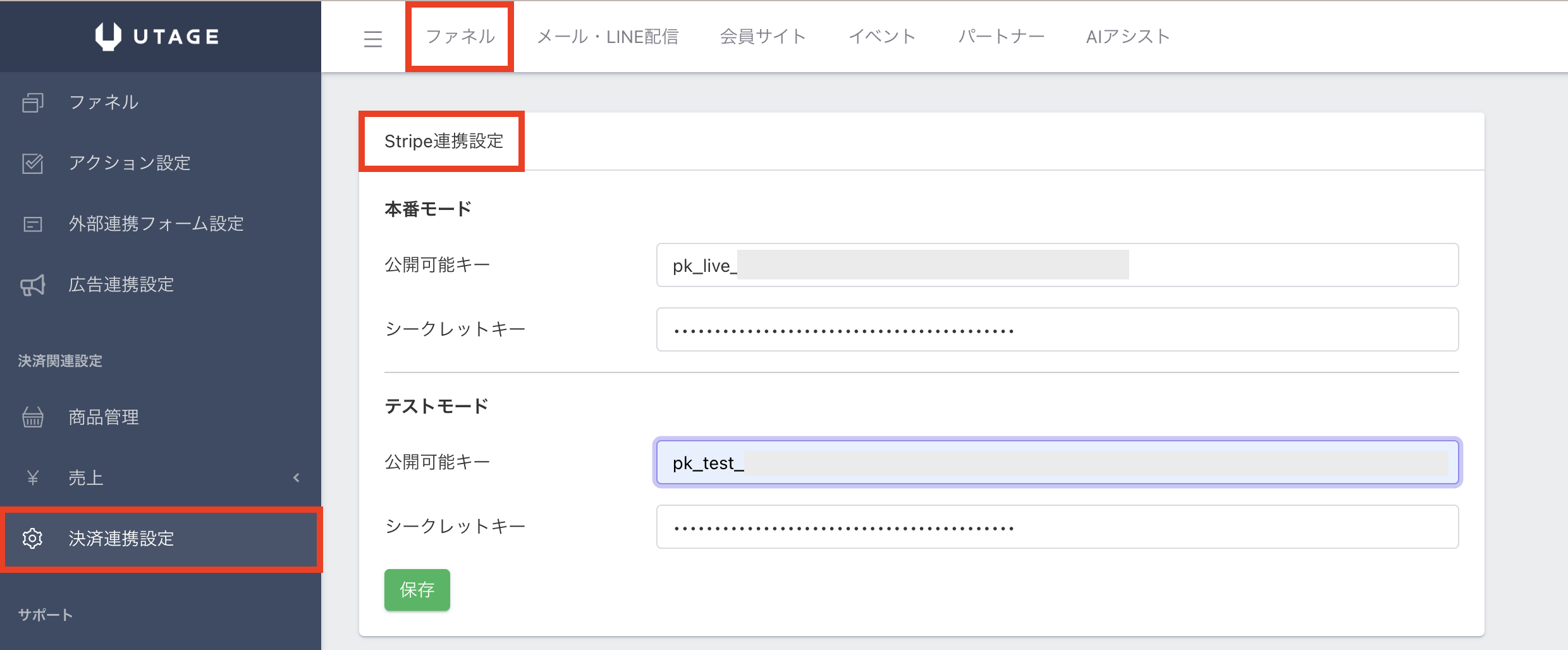 3.UTAGE画面に戻り、Stripe決済連携の『テストモード』の箇所に「公開可能キー」と「シークレットキー」を入力する。
