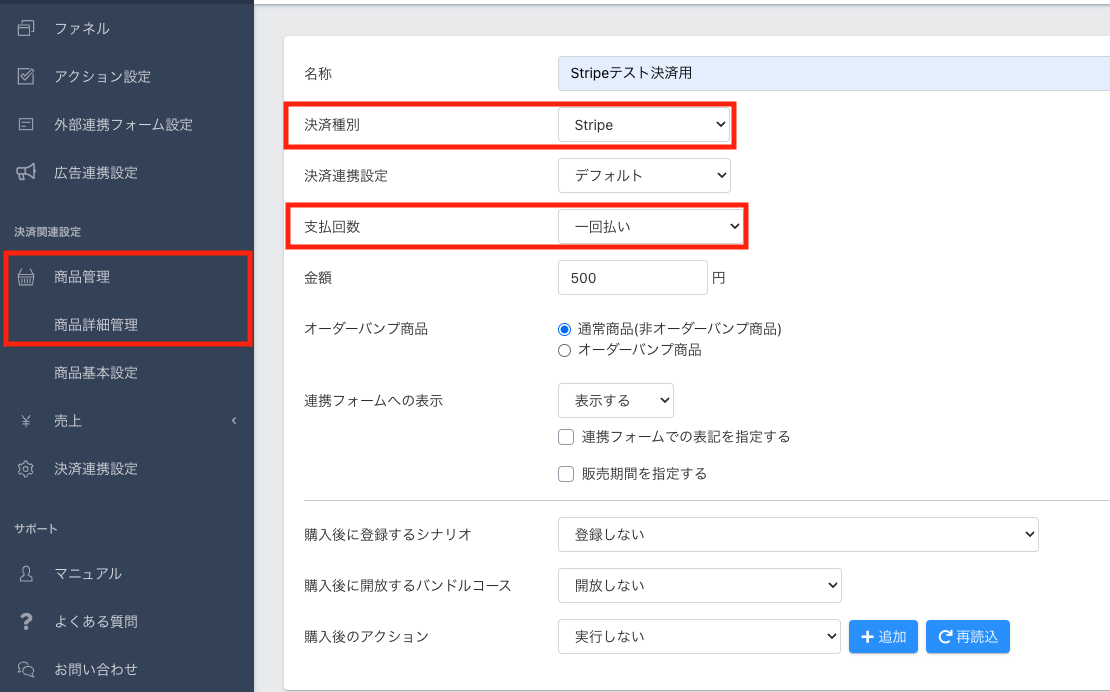 ※継続課金の場合は、UTAGE画面の商品管理>「商品詳細(価格ラインナップ)」にて「支払回数」を継続課金に設定してください。