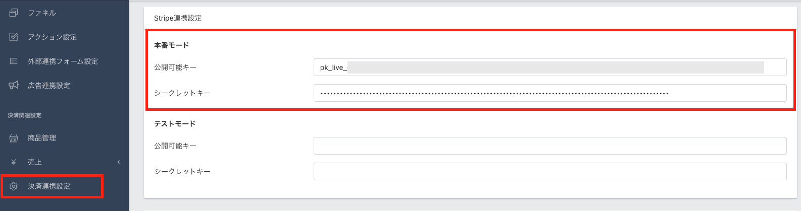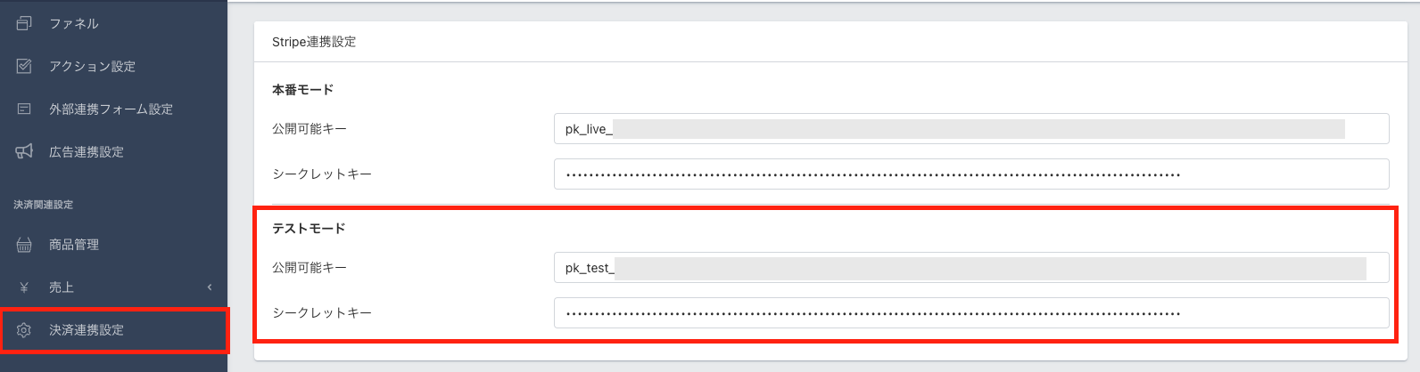 Stripeでは【本番モード】と【テストモード】両方登録しておくことで、ファネル共通設定でモードの切り替えをした際に自動で決済モードが連携されるようになります。