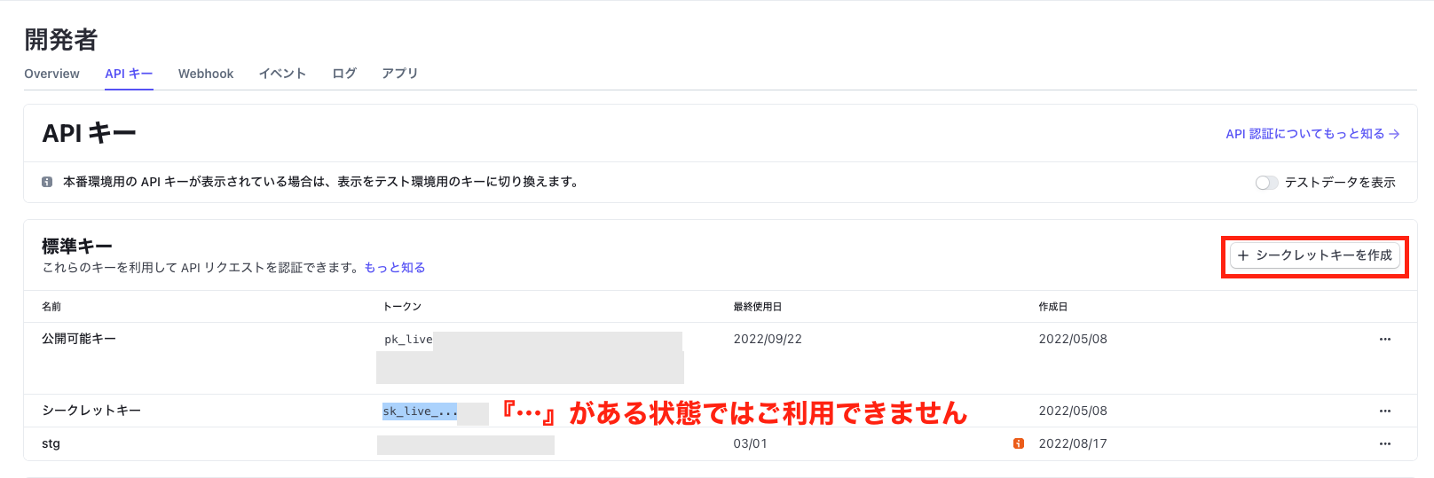 お控えがない場合は『+シークレットキーを作成』より新しいシークレットキーを作成してください。