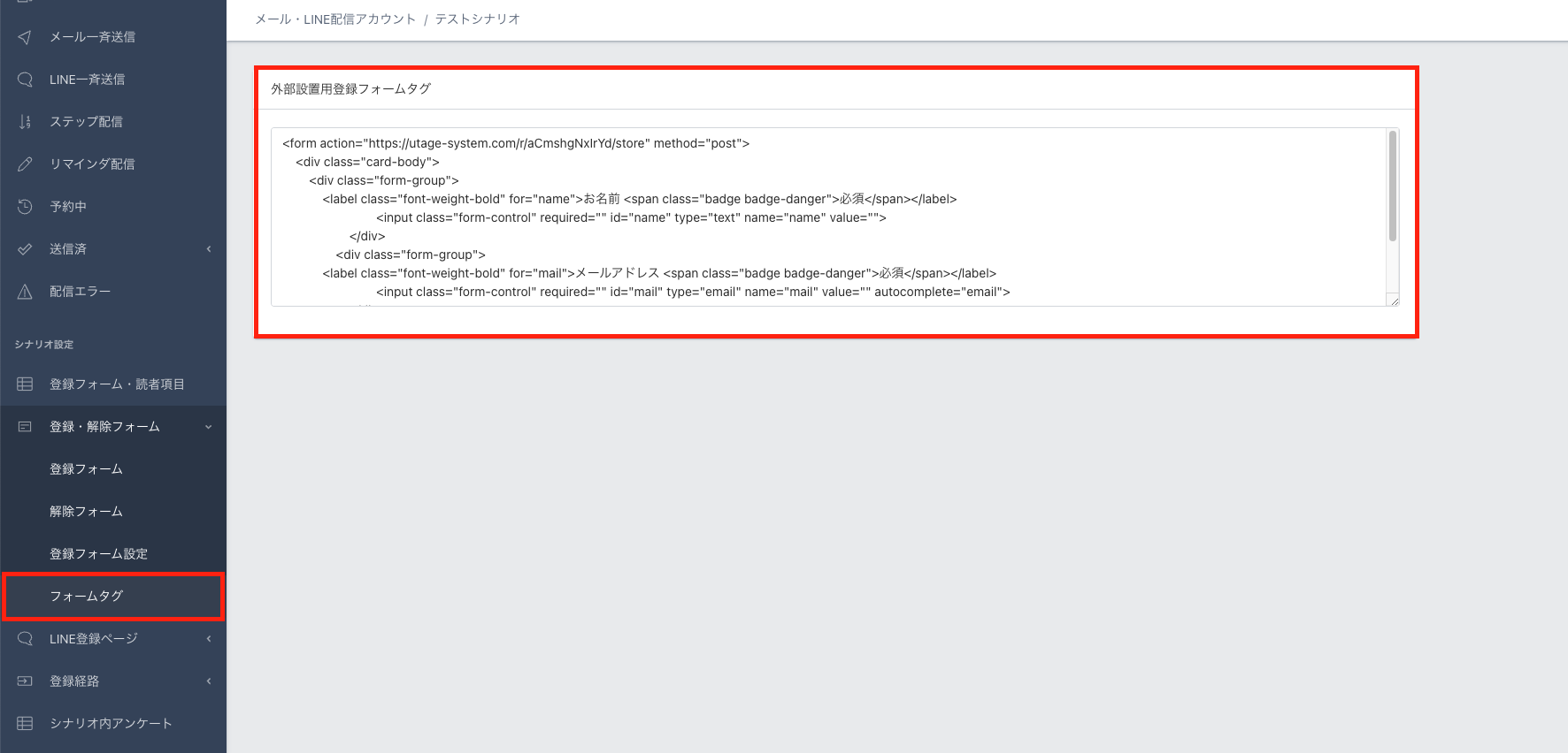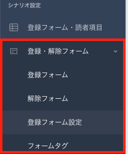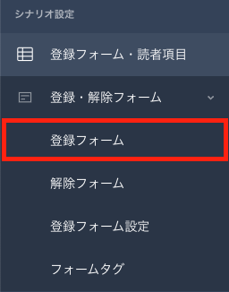 該当シナリオの左メニュー【登録フォーム・解除フォーム】>【フォームタグ】より、外部設置用の登録フォームタグを取得できます。