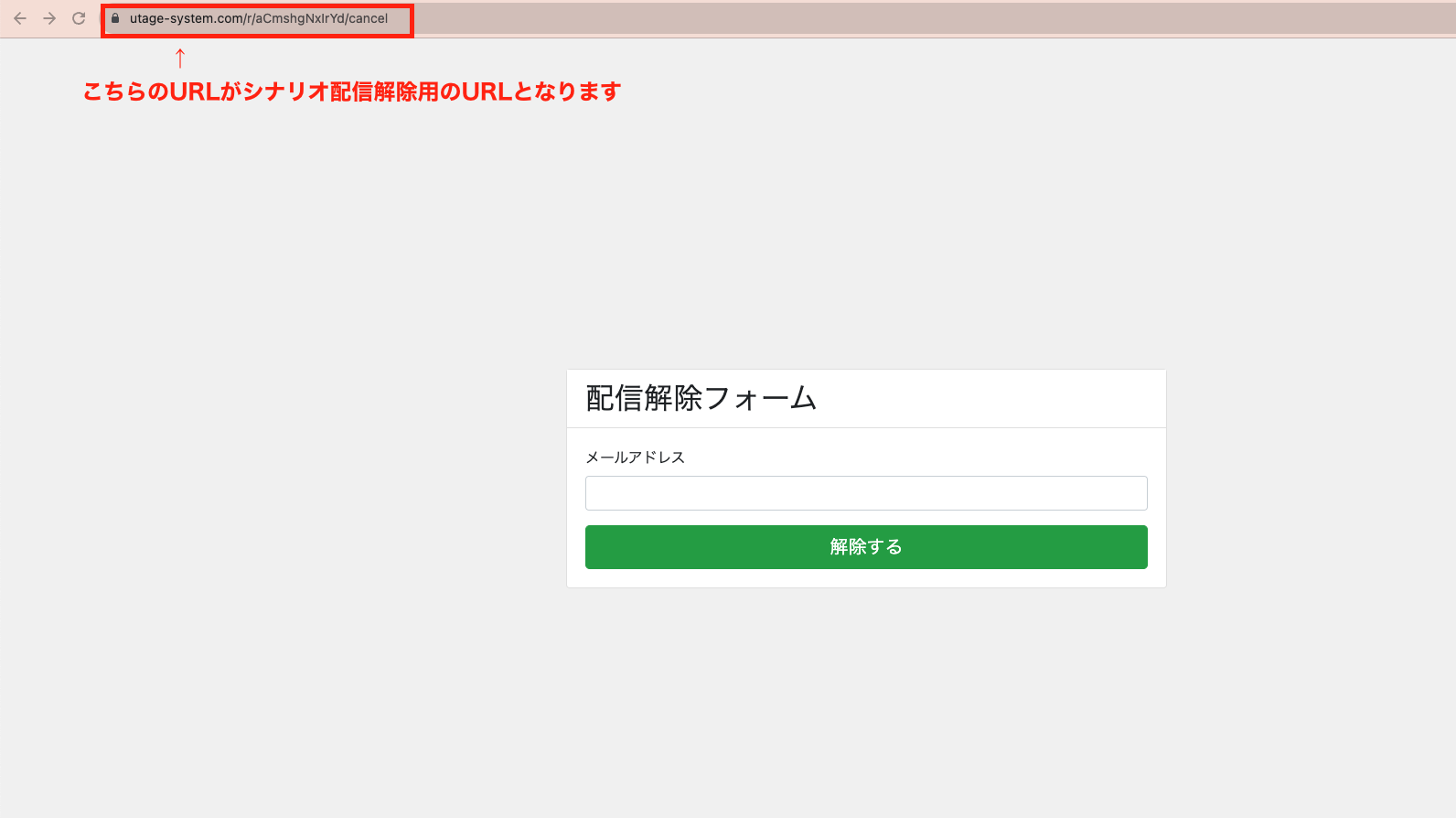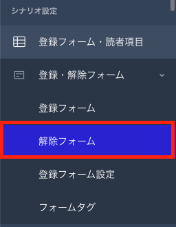 該当シナリオの左メニュー【登録フォーム・解除フォーム】>【解除フォーム】より、シナリオの配信解除フォームを表示できます。