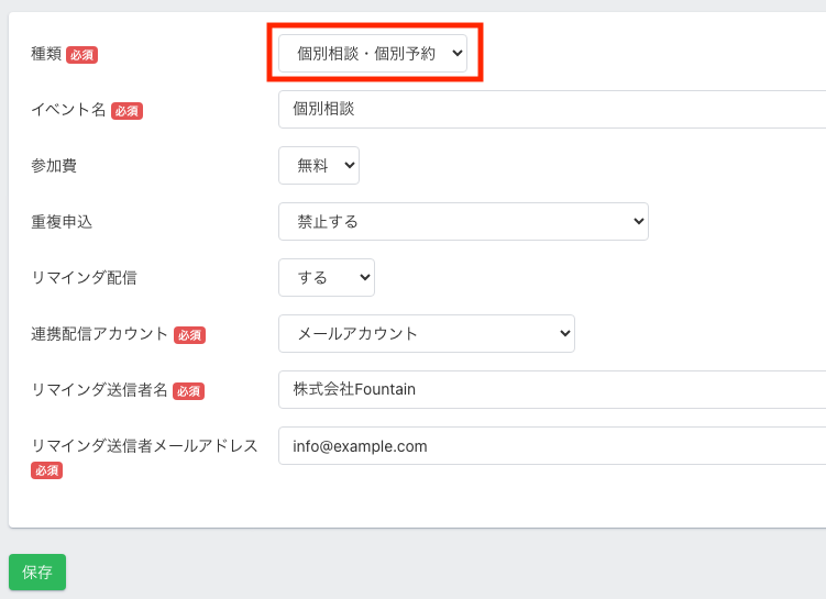 2.種類にて「個別相談・個別予約」を選択し内容を入力し、左下の保存をクリックします。