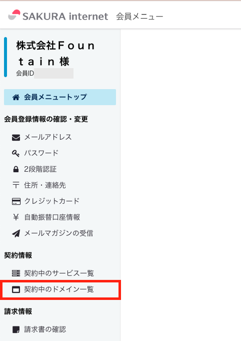 2.さくらインターネットの会員メニューが開きますので、左メニューの【契約中のドメイン一覧】をクリックします。