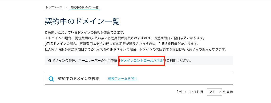 3.『契約中のドメイン一覧』画面に切り替わりましたら、『ドメインコントロールパネル』をクリックします。