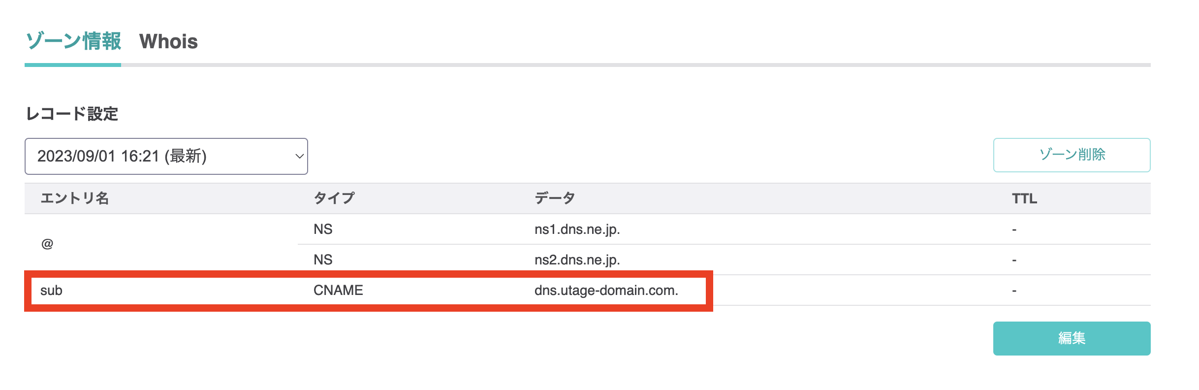 ③データ:UTAGEで発行されたDNS設定の値を貼り付けます。