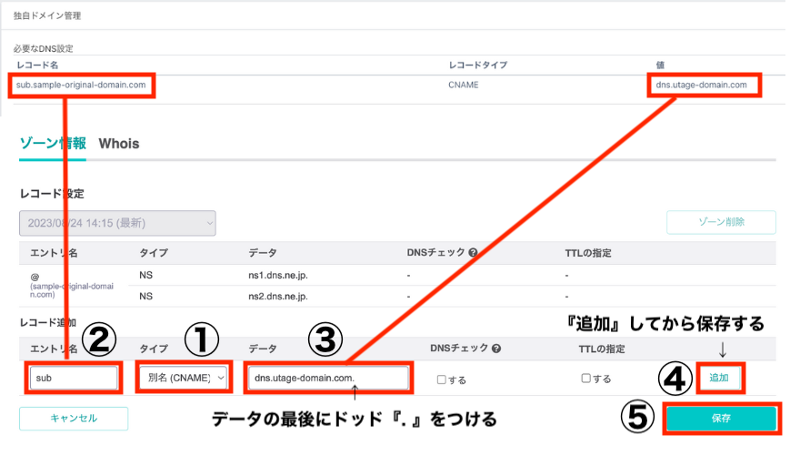 5.「タイプ」を【CNAME】にし、発行されたDNS設定内容を貼り付けて【保存】をクリックします。