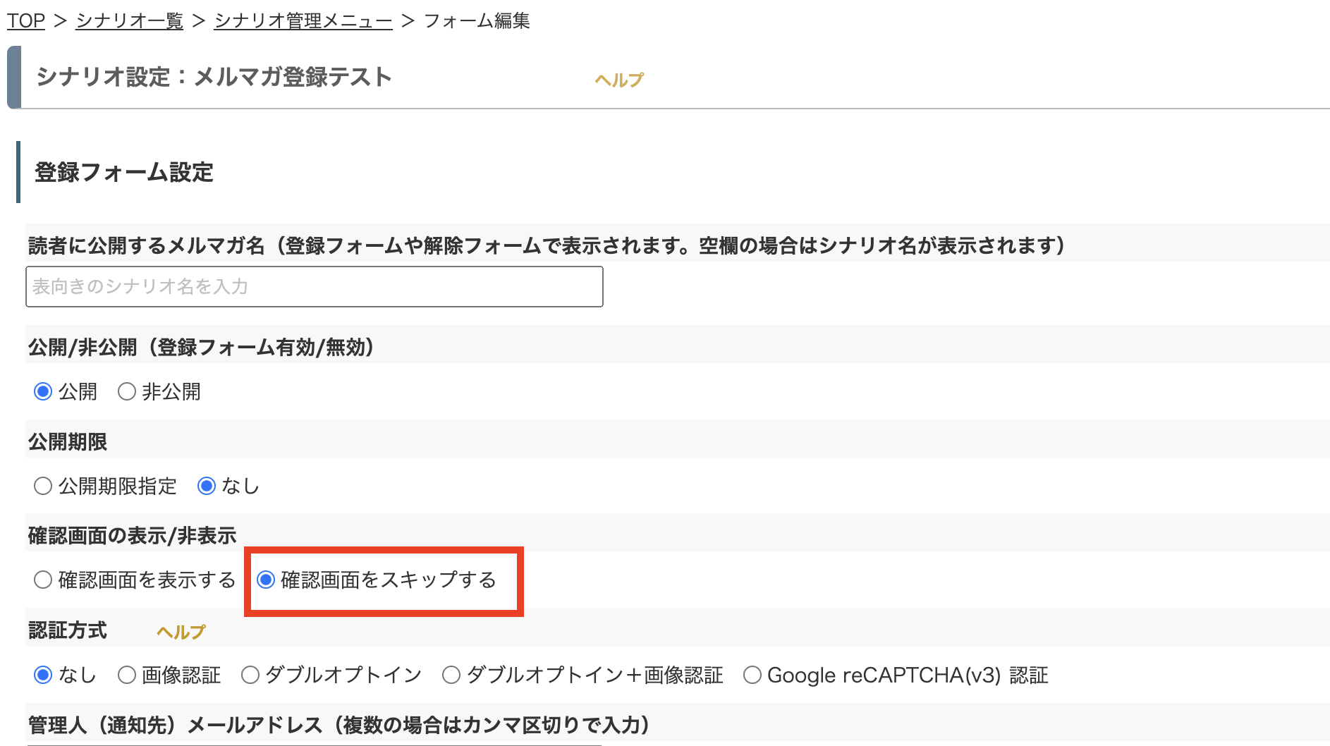 2.【登録フォーム設定】>【登録項目基本設定】>【確認画面の表示/非表示】>より