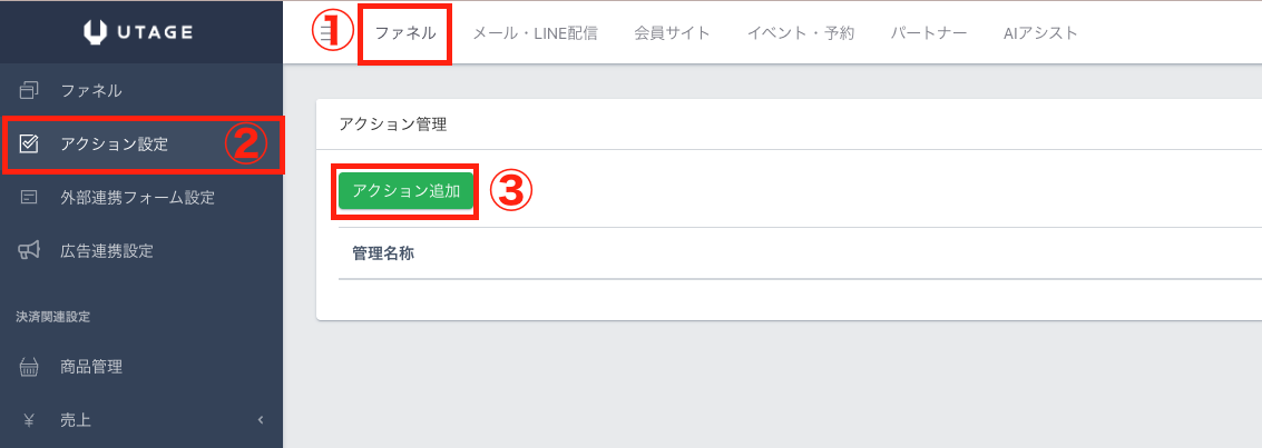1.上メニュー【ファネル】をクリックし、左メニューより【アクション設定】をクリックします。