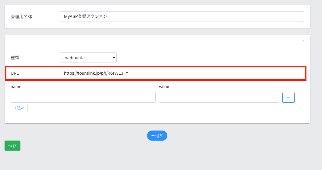 4.『URL』には『MyASP側設定』手順3でコピーしたシナリオの登録フォームのURLを貼り付けます。