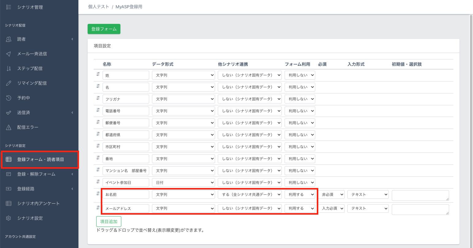 4.作成したシナリオの【登録フォーム・読者項目】で、利用したい登録項目を「利用する」に設定します。