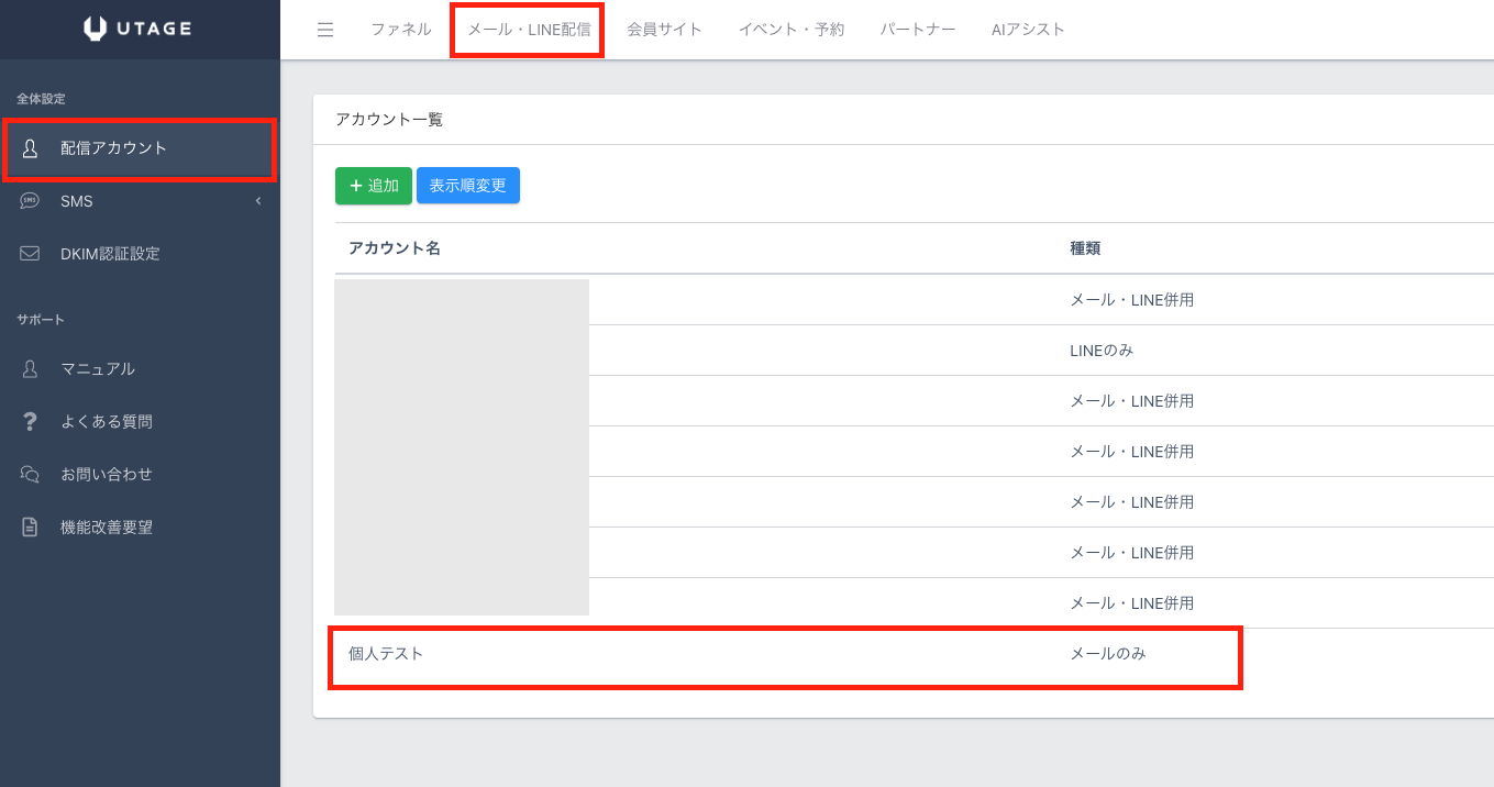 1.上メニュー【メール・LINE配信】をクリックし、アカウント一覧から配信アカウントを選択します。