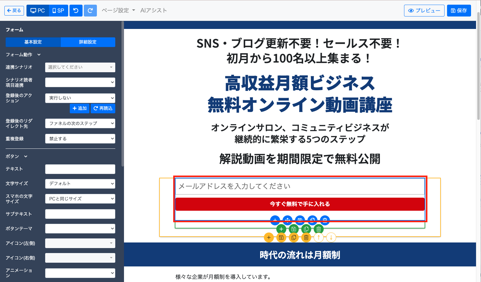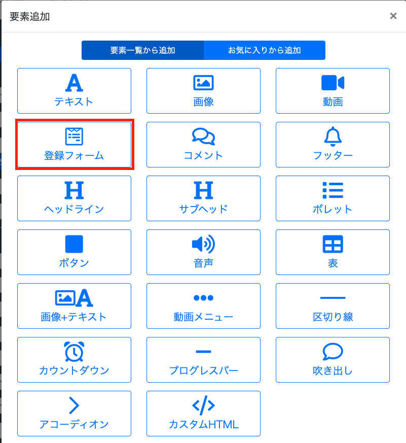 1.ファネルの編集ページより【登録フォーム】要素を挿入します。