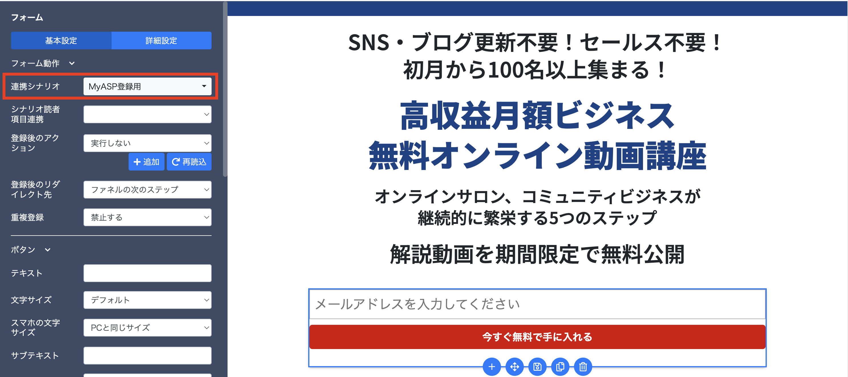 2. 登録フォームを選択すると左側にフォームの設定項目が表示されます。