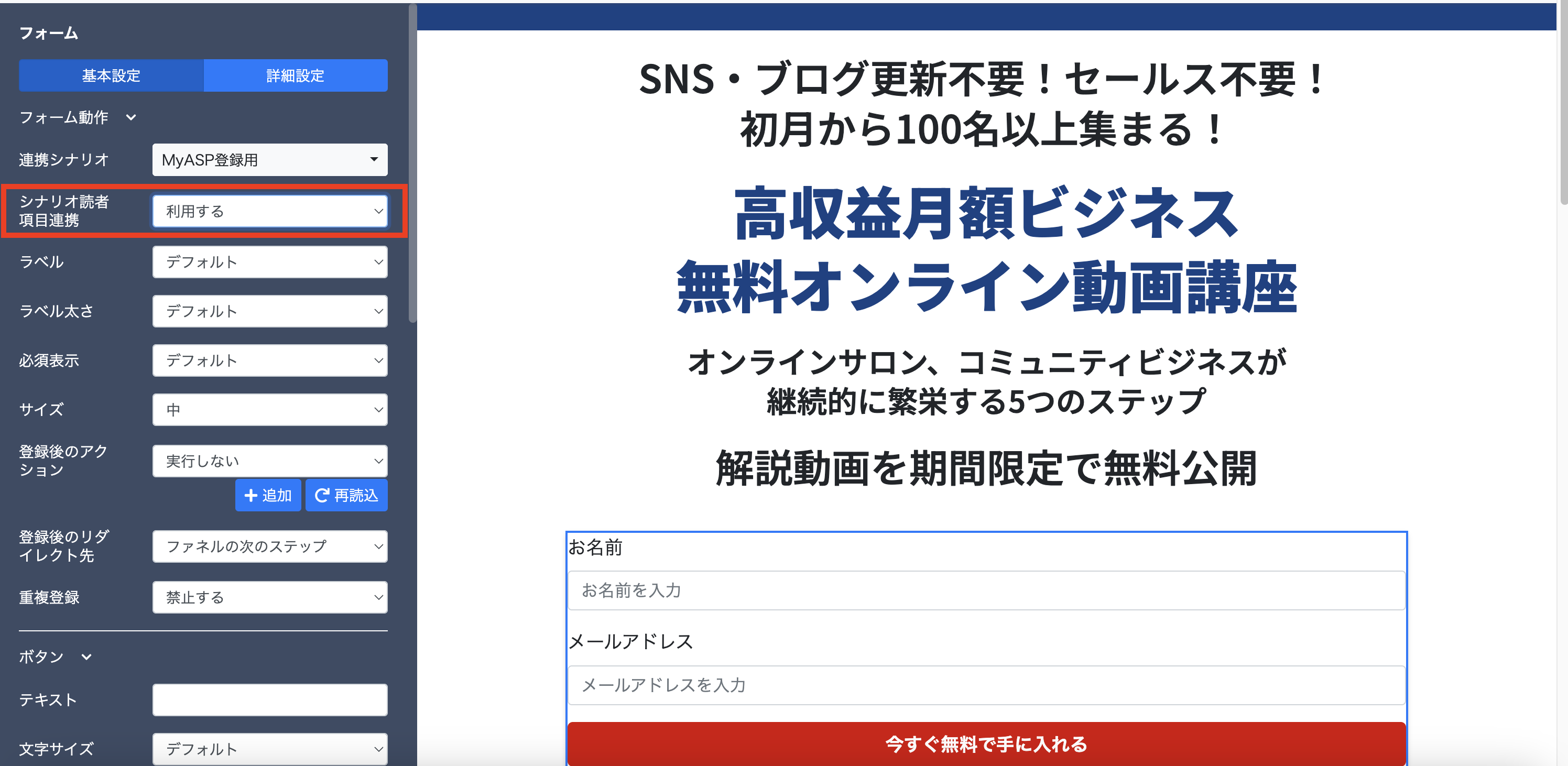 4.【シナリオ読者項目連携】:「利用する」を選択するとシナリオで設定した読者項目が表示されます。