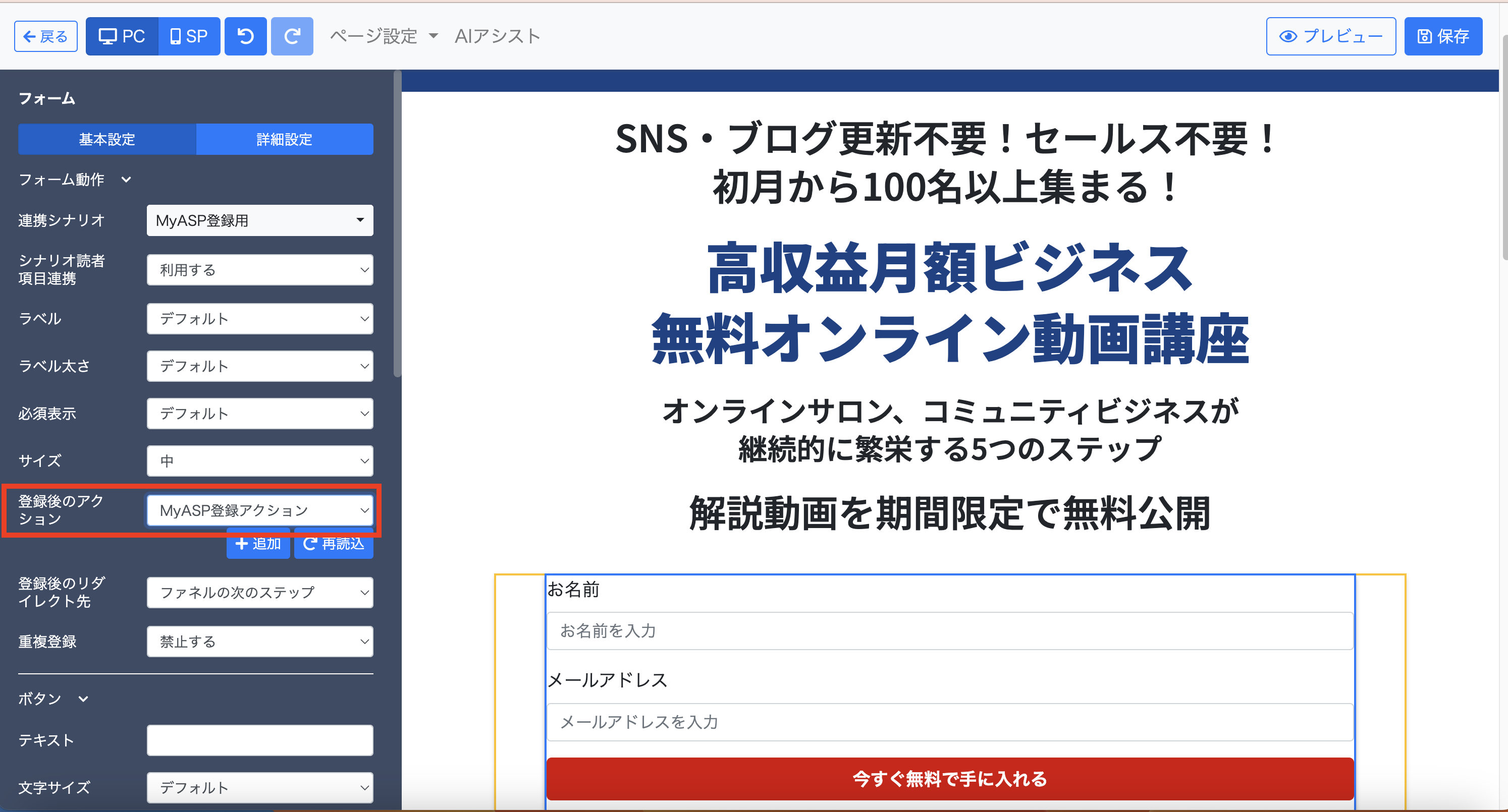 5.【登録後のアクション】で【UTAGE側の設定(ファネル)】で作成したアクションを選択します。