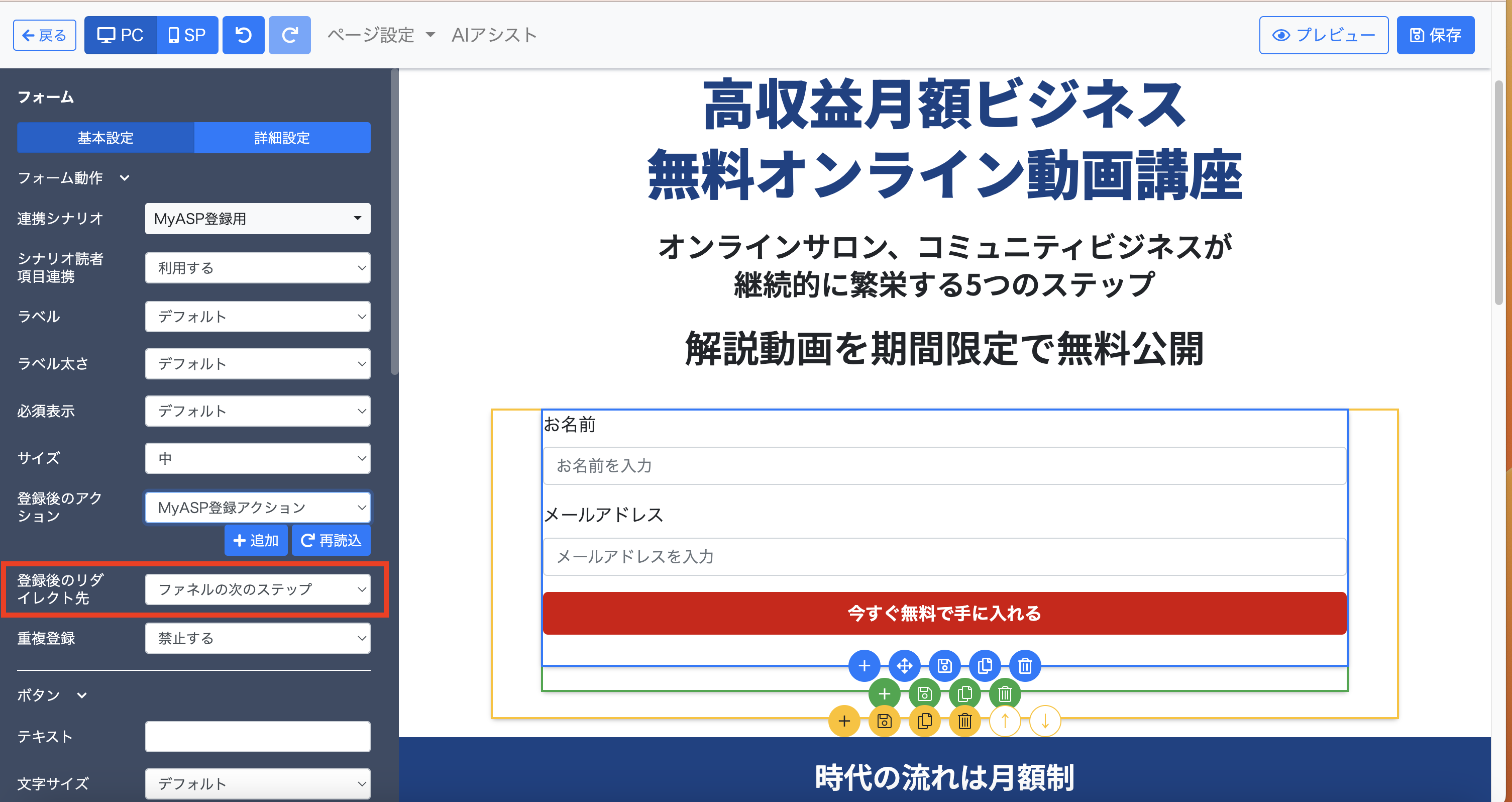 5.【登録後のリダイレクト先】で登録後に表示するページやURL(サンクスページなど)を設定します。設定が完了したら右上の【保存】ボタンを押下します。