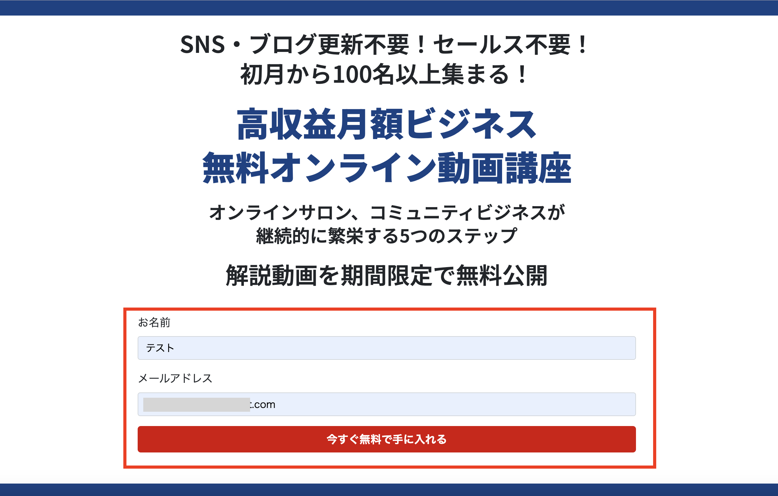 1.メールアドレス登録ページを開き、名前とメールアドレスを入力し、テスト登録します。