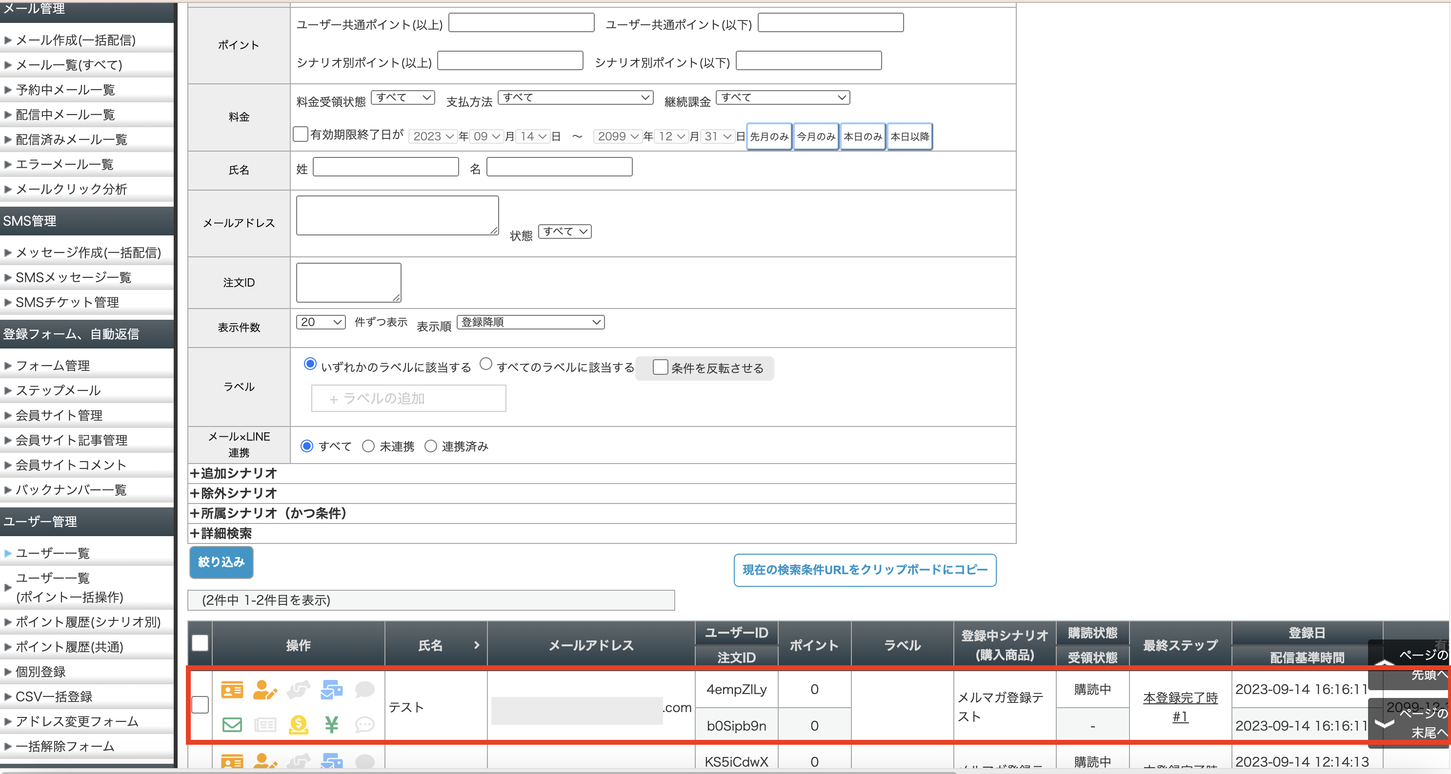 3.MyASPの『ユーザー一覧画面』より読者追加を確認できます。