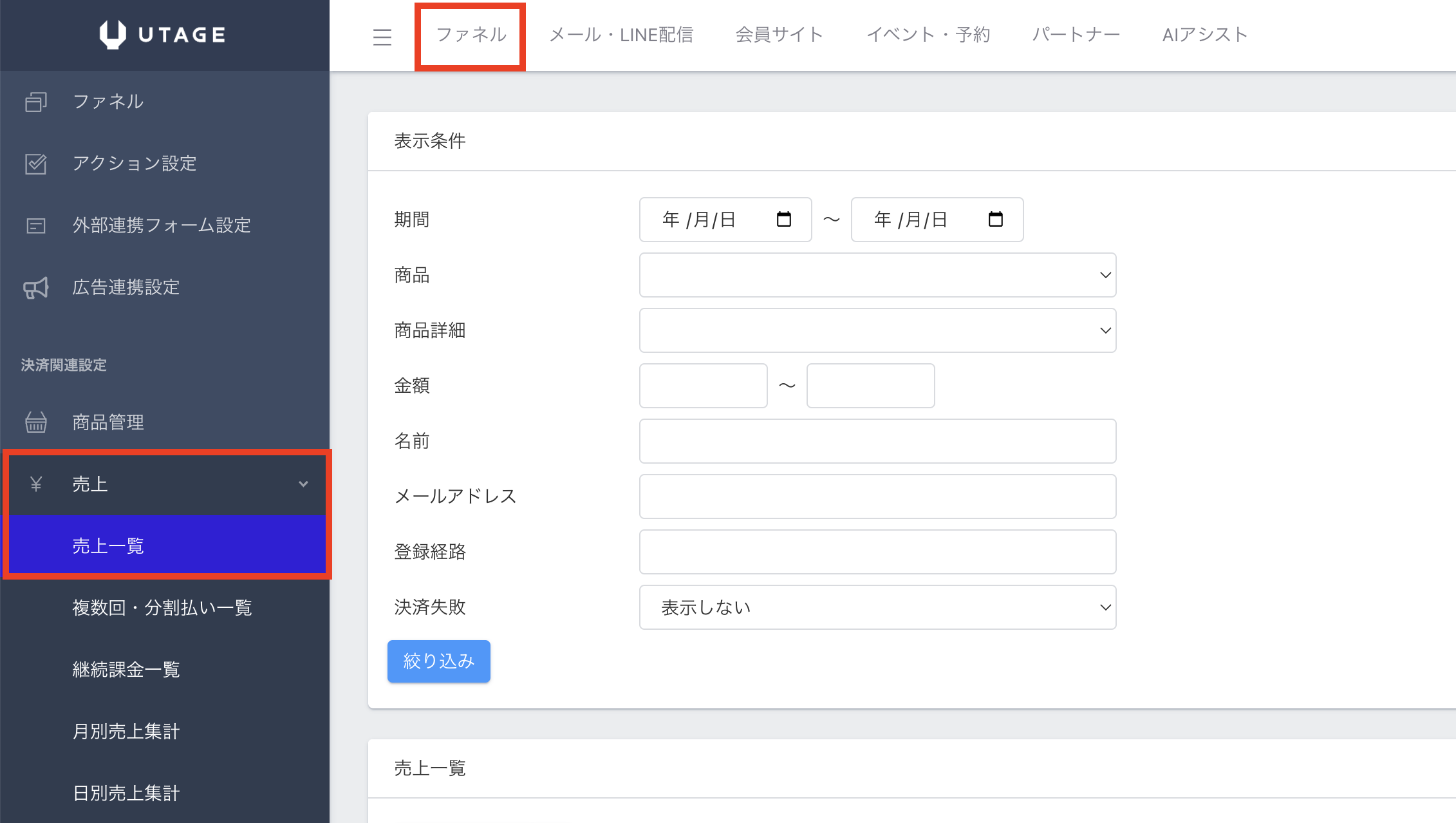 1.上メニュー【ファネル】>左メニュー【売上】>【売上一覧】をクリックします。