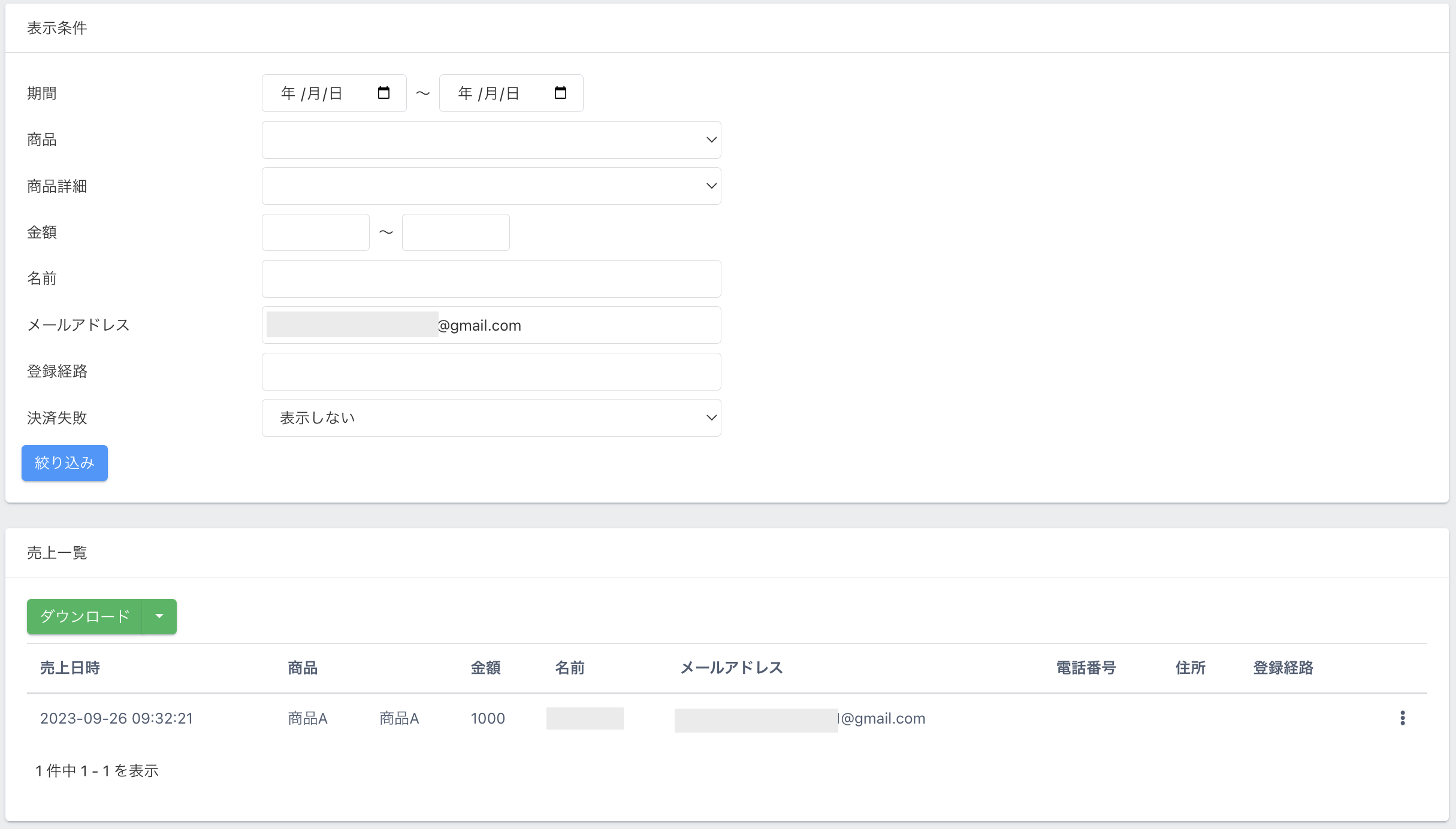 2.個別に領収書を発行したい購入者を売上一覧より探します。必要に応じてメールアドレスや商品名などで絞り込みをしてください。