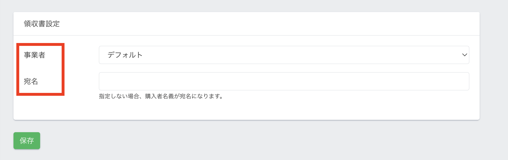 4.領収書設定ができます。『事業者』『宛名』に変更がある場合、入力して保存してください。