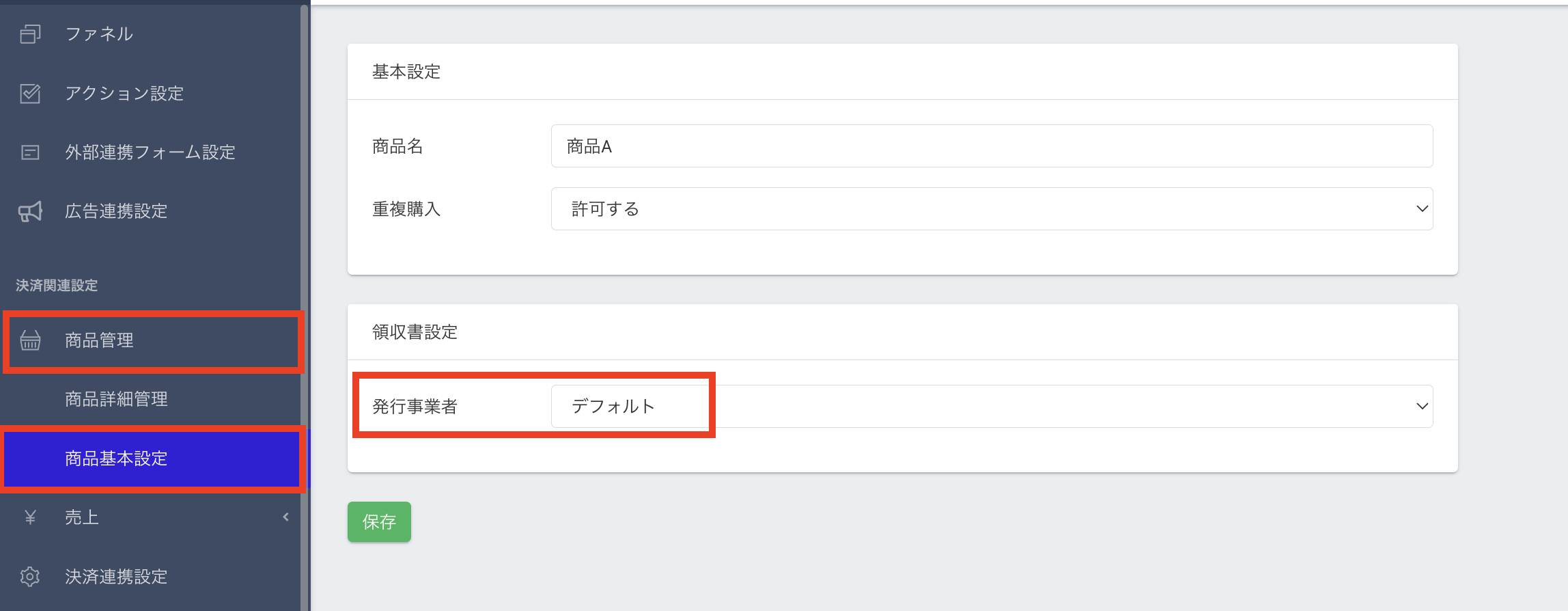 【商品管理】>【商品基本設定】>【領収書設定】にて発行事業者がデフォルトになります。